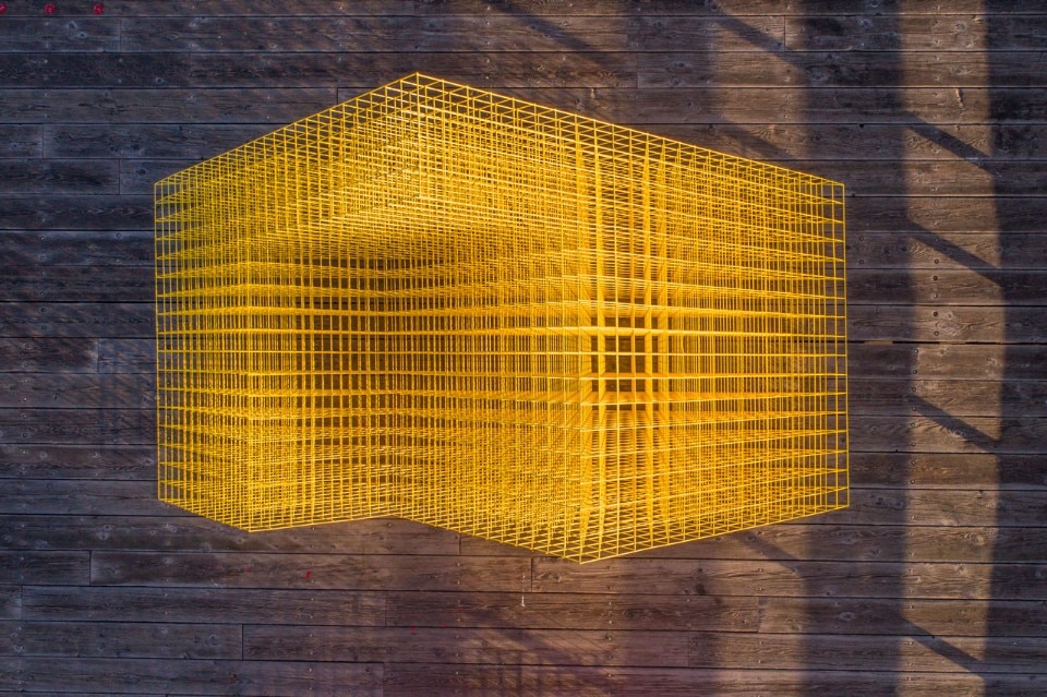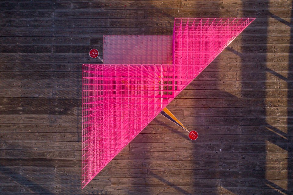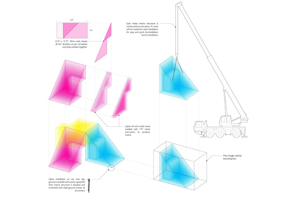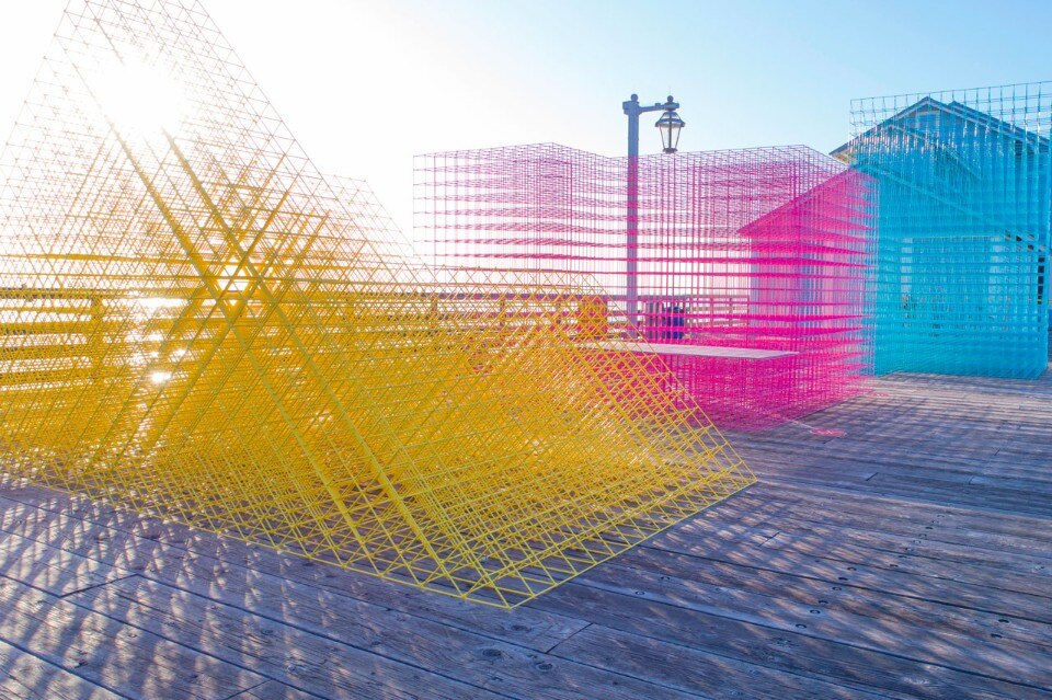 Constructed as a matrix of thin steel rods, the pavilion design features three modular objects that can be oriented in a number of ways. Runaway invites communities to view and interact in unexpected ways with their surroundings, and, in doing so, encourages residents as well as artists to consider how contemporary design can activate and energize public spaces.