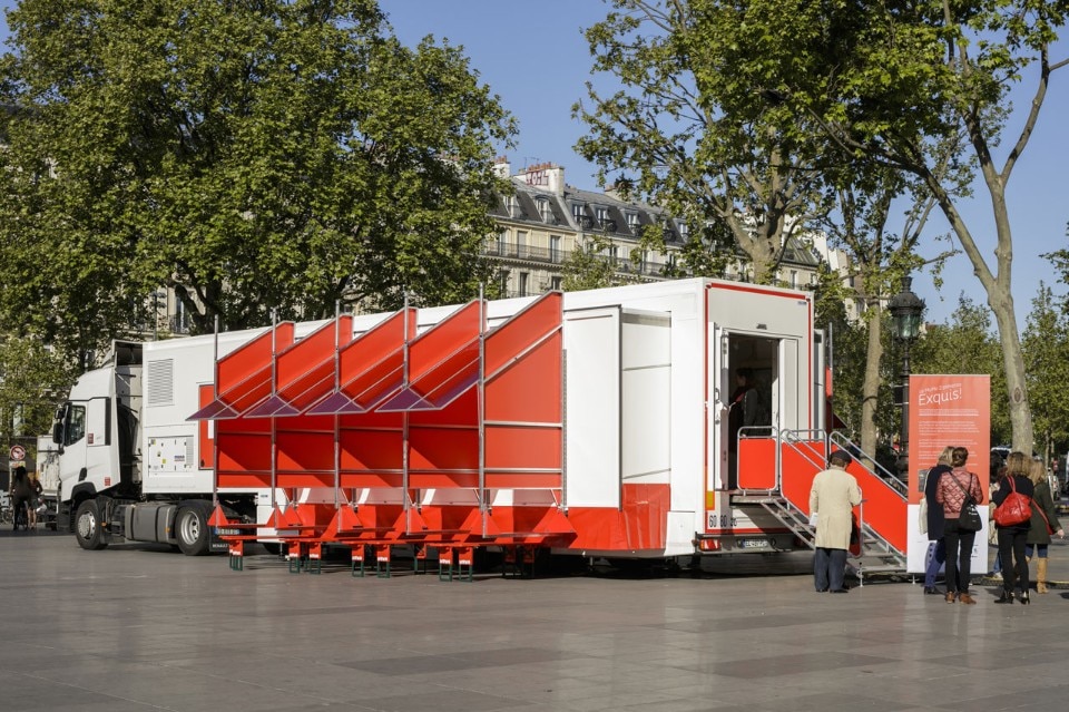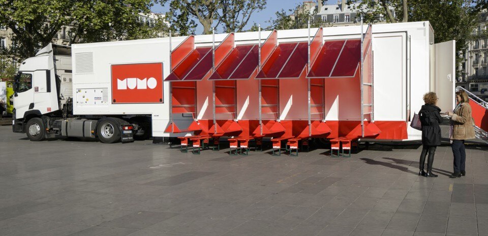MuMo is a lorry that arrives in a village and brings an altered reality, just like a circus. Imagined as an open sharing place for a more intimate approach to contemporary art, the new version of the MuMo shelters a modular show space and a projection room for broadcasting the collections of the “Regional contemporary art funds” (Frac).