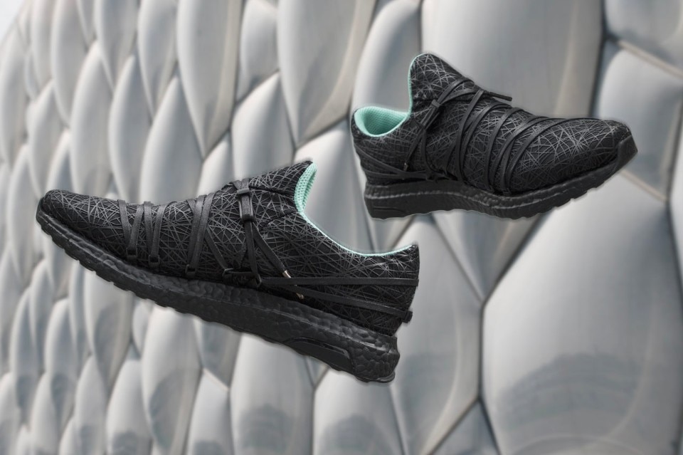 The lacing system consists of two continuous laces that loop around support points in the upper part and around the heel of the shoe. The lock is a 3D printed double-loop cinch that keep the laces in place. Along the heel is another lace-lock to keep the network from sliding. The textured skin beneath the exposed structural lacing is an abrasive-resistant poly-urethane fused to a Lycra base. The upper part was lasted and baked at 300 degrees to hold its form in place.