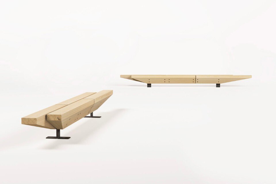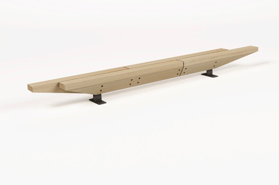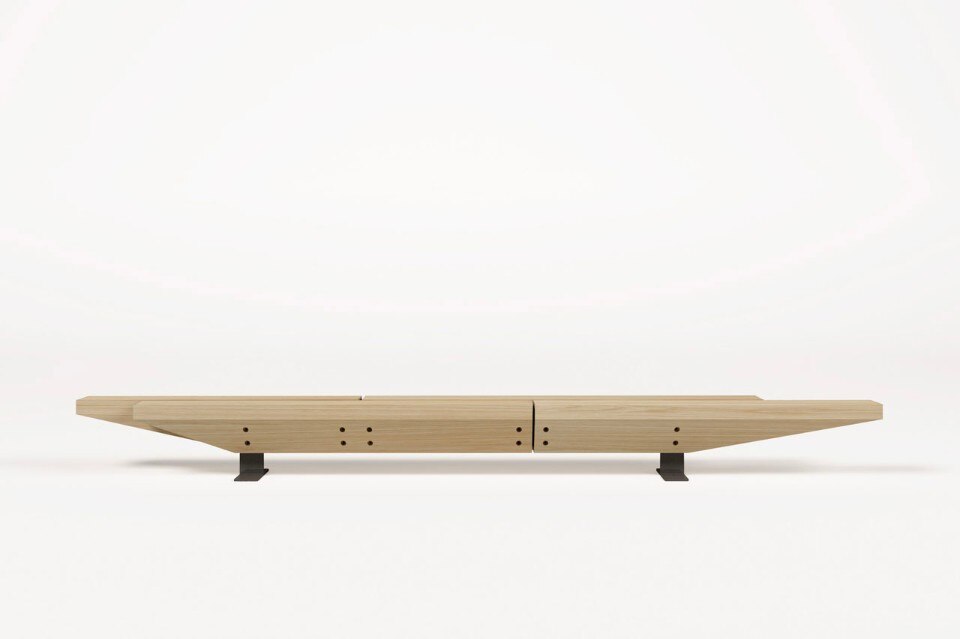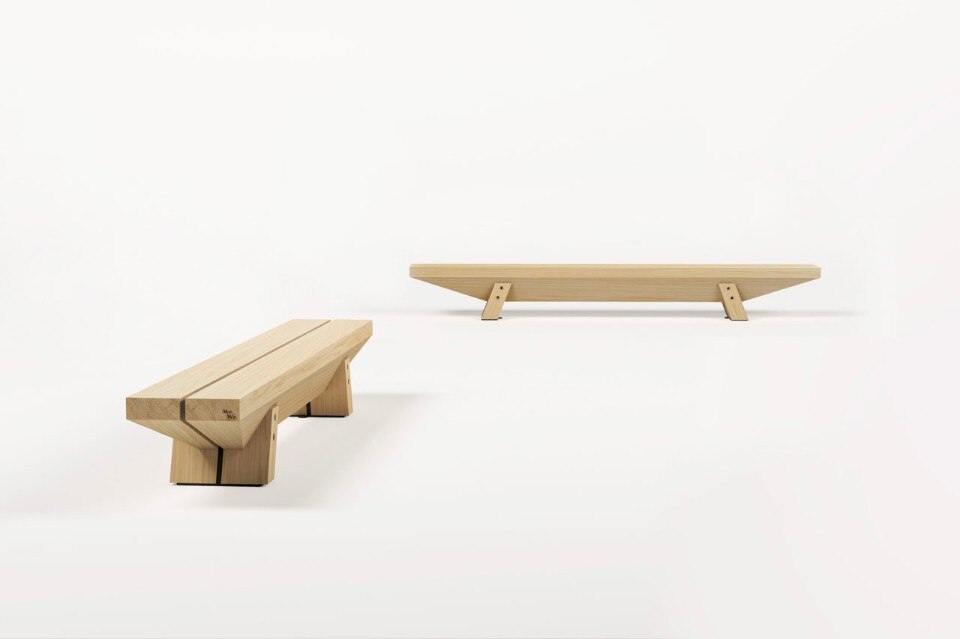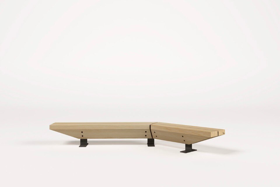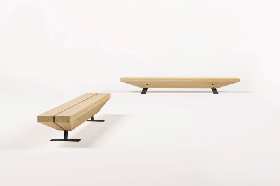 The bench consists of a trunk that is cut in two parts and assembled on a metal or wooden base, with large and generous proportions. The composition plays with assemblages coming from the techniques of carpentry. Beam is intended for indoor and outdoor, and features an element that allows for ground fixing. It is possible to create different configurations, making it a multifaceted piece that can be used for contract furnishing, and it is available in two natural finishes: with oil or burnt, using the traditional Japanese technique of Shou Sugi Ban – wood charred with fire.