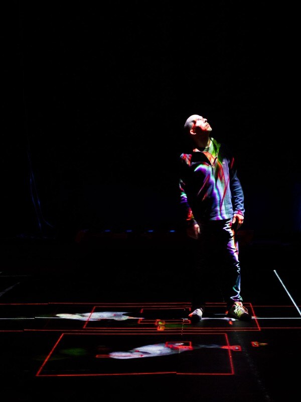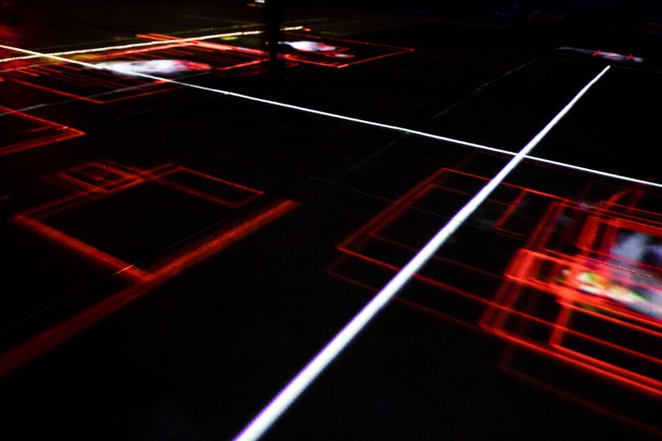 The artists conjure up an environment that envelops visitors and transforms them into active elements in the work. Visitors make their way through the Armory’s bunkers and are plunged into darkness until they encounter a 5-foot high bluff filling the cavernous space of the Drill Hall. Their movement is recorded by infrared cameras, broadcast to a global online audience, and fed back into the installation. The visitors’ image is projected back onto the floor, becoming interrupted by shadows formed by surveillance drones that periodically survey the Drill Hall. The experience inverts the fairytale of Hansel & Gretel— instead of purposively leaving a trail to avoid getting lost, the surreptitious tracking of visitors makes it impossible to hide their location.