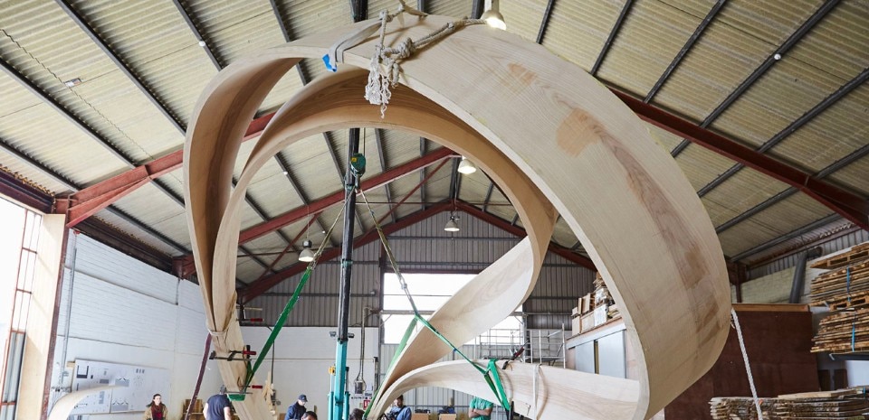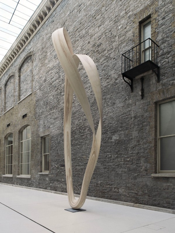 A large scale, seven metre tall, free-form sculpture made of multiple layers of laminated olive ash wood is now displayed in the new Courtyard as part of the Gallery’s permanent collection. Magnus Modus is the third large scale installation of the Magnus series. Resting upon a small Kilkenny lime stone base, the sculpture delineates space in its slender aspect, stationed on a tiny footprint, reaching upwards and then outwards. As the sculpture ascends, it becomes lighter and reacts to subtle changes in atmosphere. It creates surrounding spaces, shadows and delicate lines of movement, thereby transforming the viewer into an actor by its responsive presence.