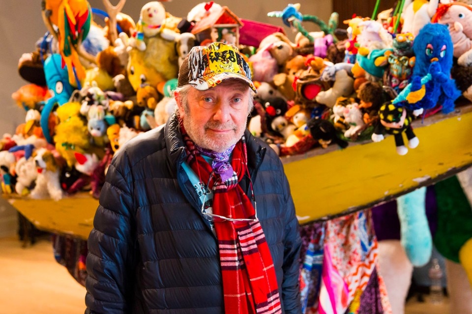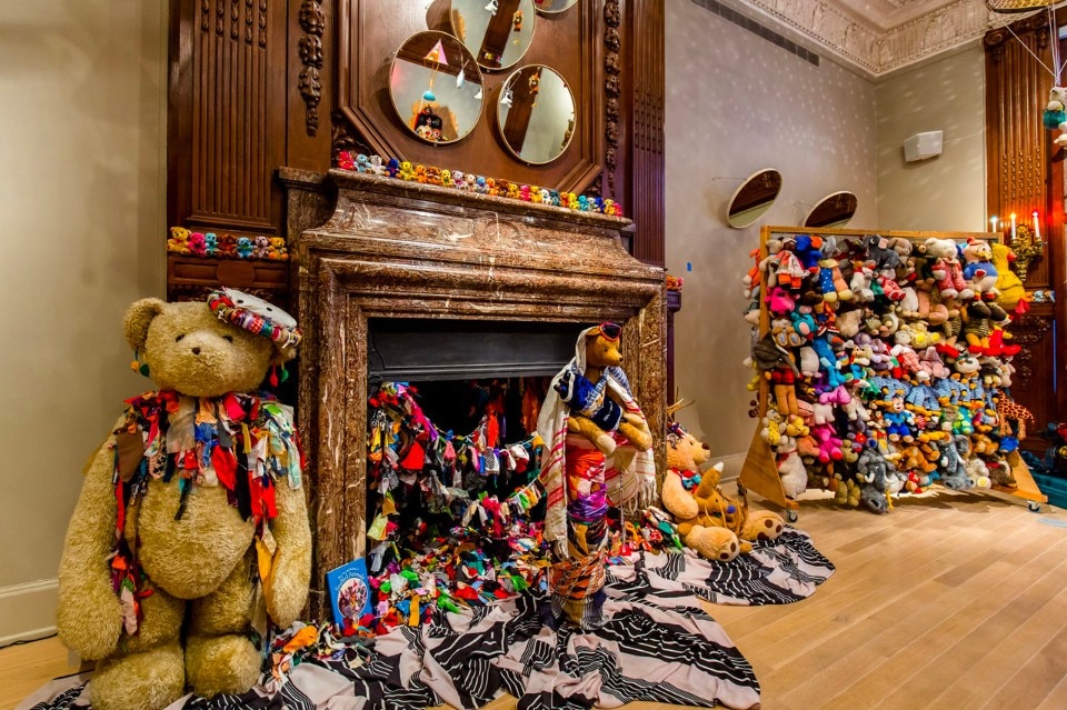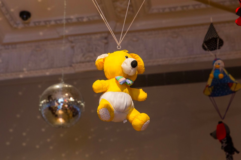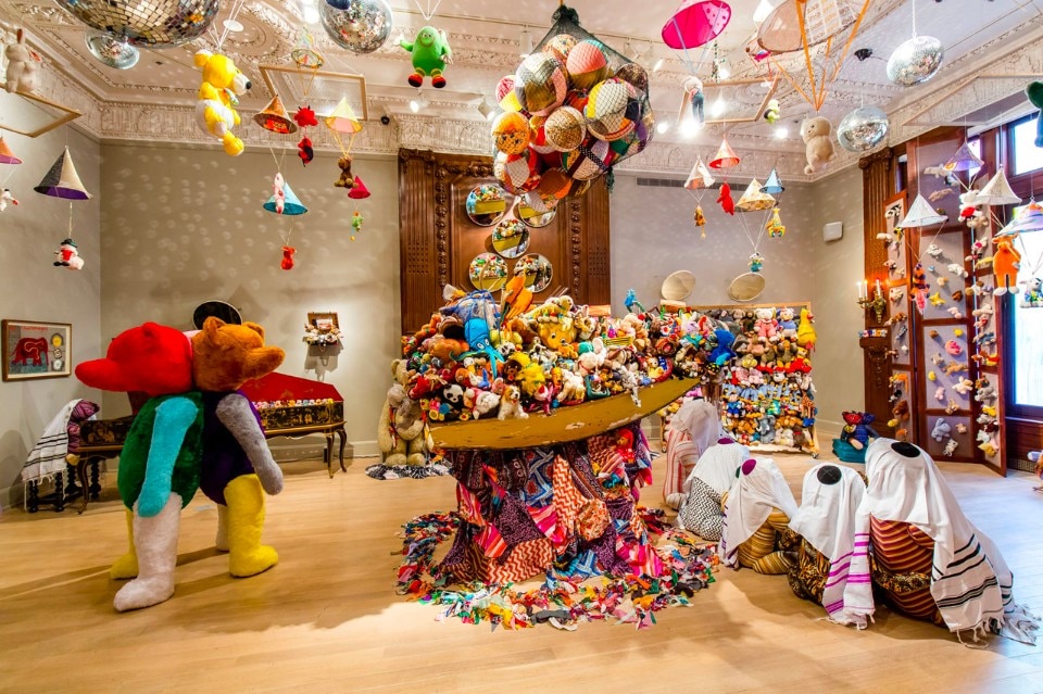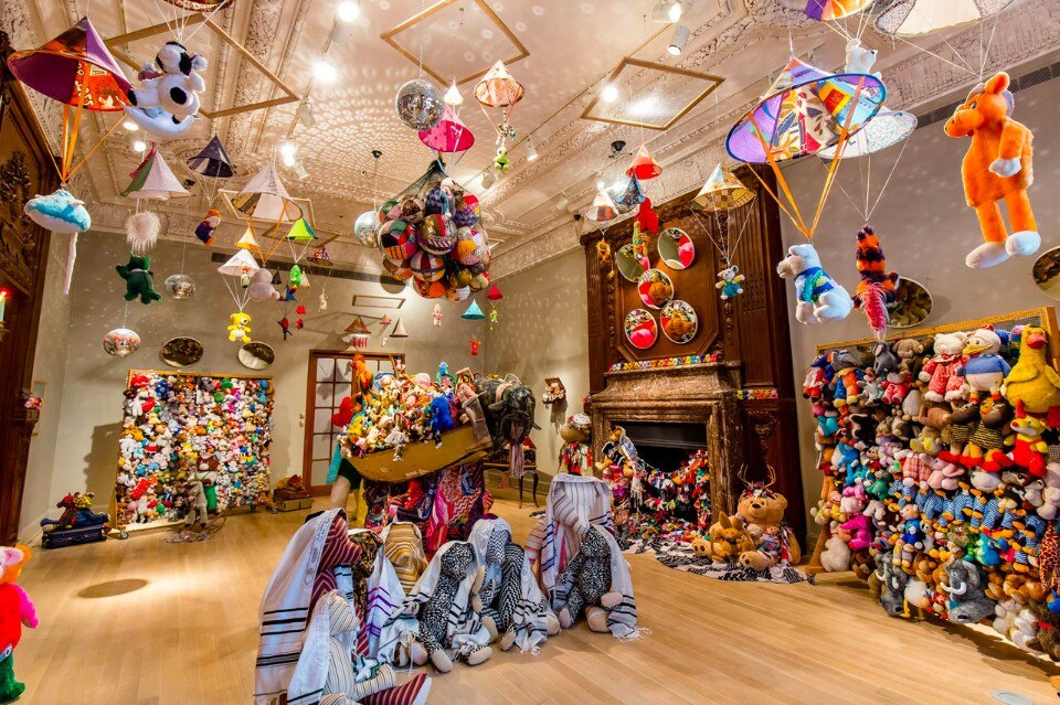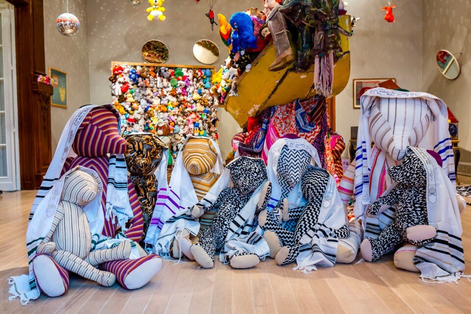 Charlemagne Palestine’s “Bear Mitzvah in Meshugahland” features hundreds of plush toys, including teddy bears, which the artist regards as shamanic representations of the soul. Charlemagne Palestine, best known for his avant-garde and experimental music compositions beginning in the 1960s, has been incorporating bears and other plush toys into his installations and performances for decades. The teddy bear’s invention in 1902 by an immigrant Jewish couple in the same Brooklyn neighborhood where Palestine was born has become a near obsession for the artist.