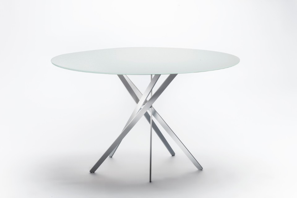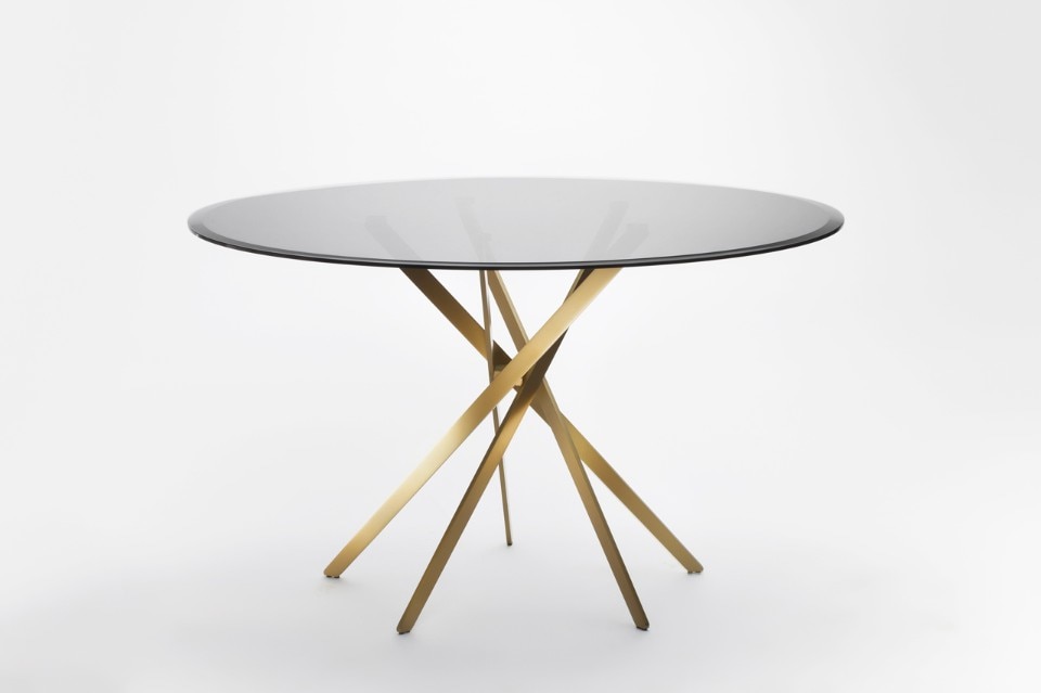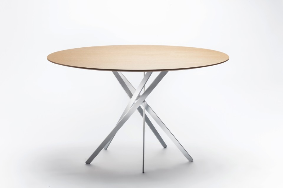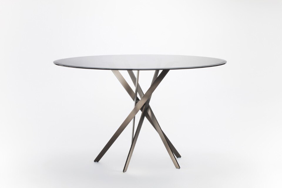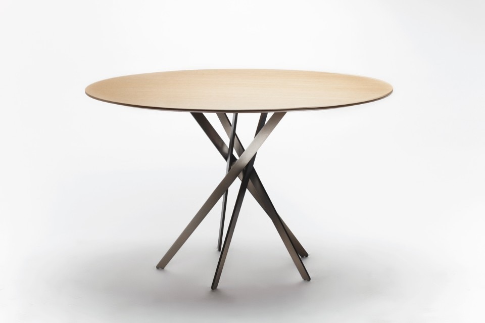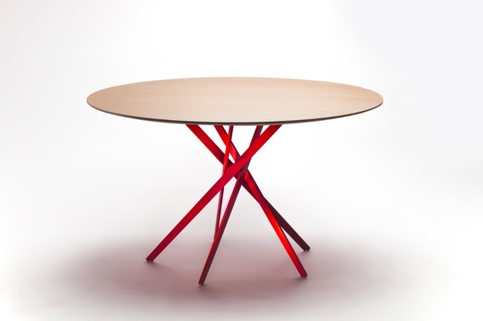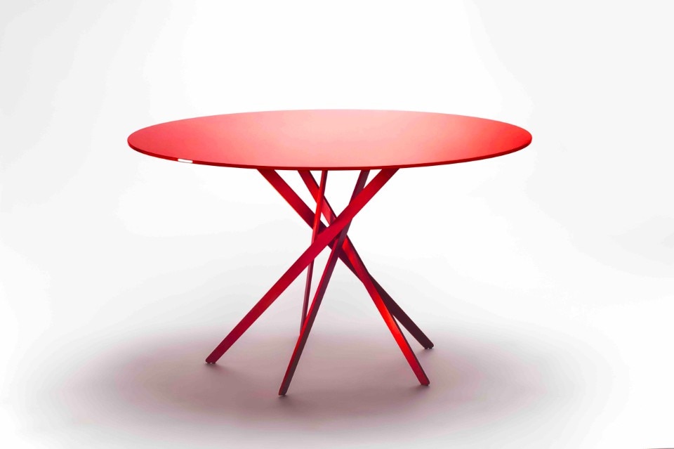 The table is composed of five legs and one central metal pentagon. Metal bases can be dark bronze, red or white matt or golden lacquered. The tables tops range from the lacquered extra clear glass to wood veneer. With Iki, Marco Zanuso jr offers the ideal and convivial place characterized by pure lines and an architectural design.