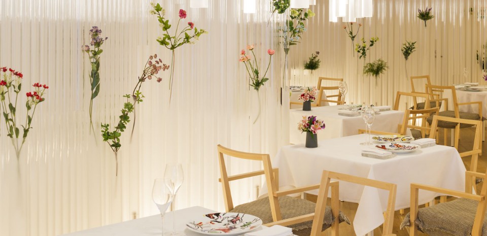 The main feature of this space are the suspended flowers, which are arranged in cylinders made of wooden bar and acrylic. Kengo Kuma’s aim was to create a gentle atmosphere by using an unconventional element of architecture.