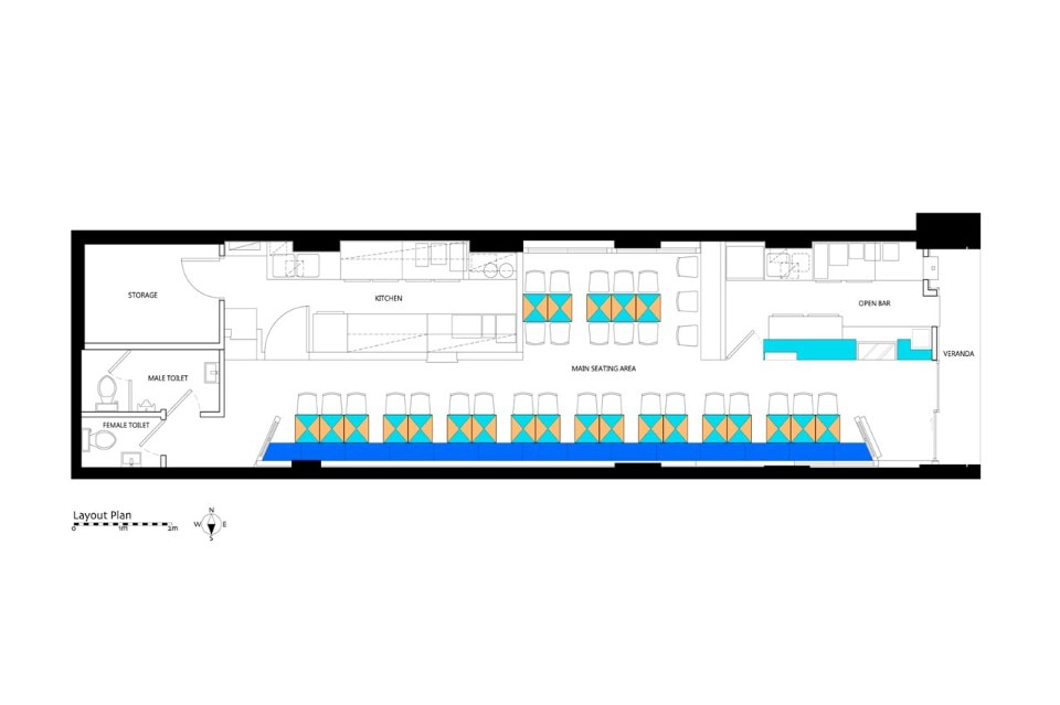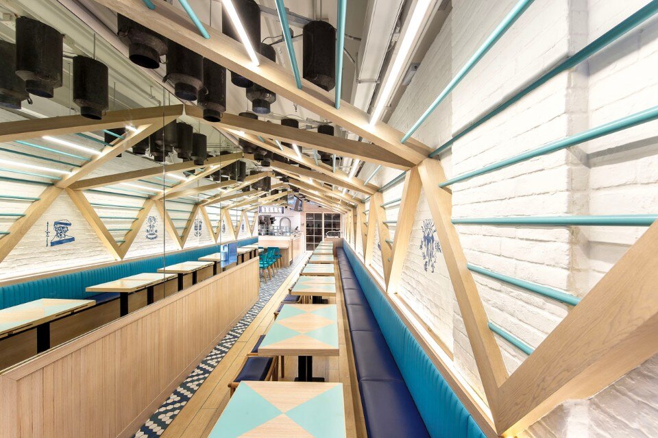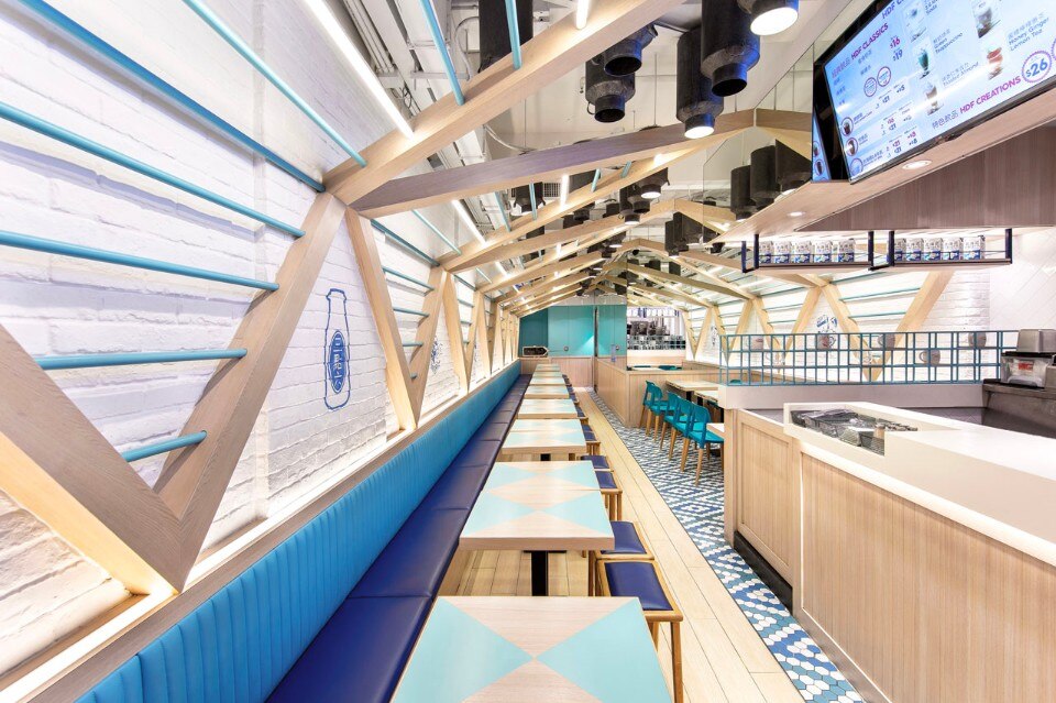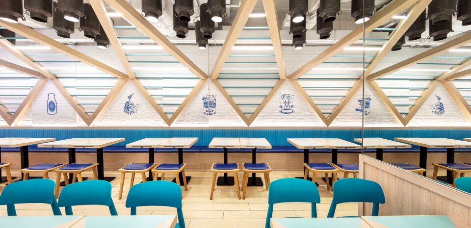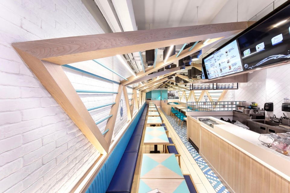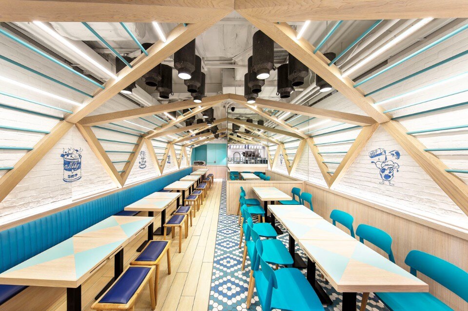 Given the importance of the dairy product representing the company’s identity, the interior and frontage design draw elements from a typical dairy farm such as the straws, the pitched roof, the blue sky, the milk, the standalone post box as its inspiration. These elements would also be distributed carefully to coincide with the corporate colours scheme which dictates a 50/30/20 split between the colour white, brown and blue.