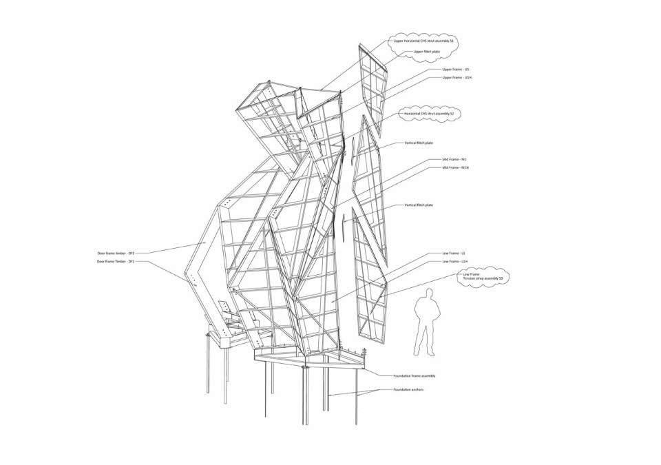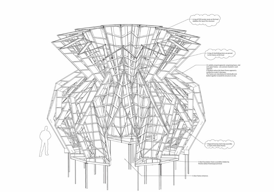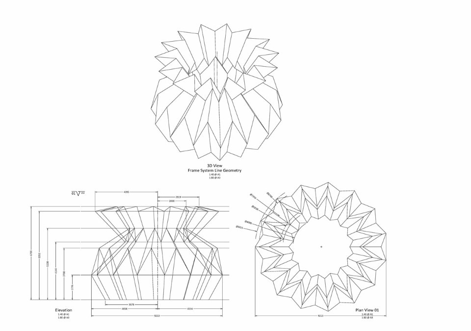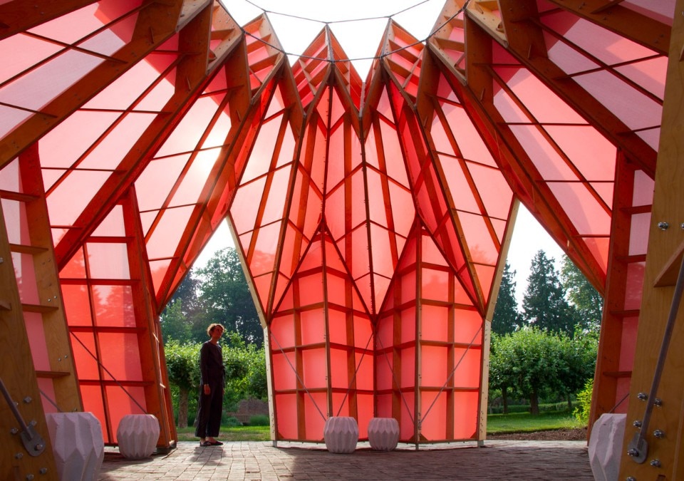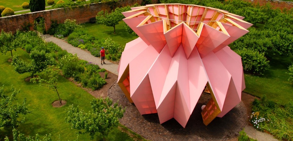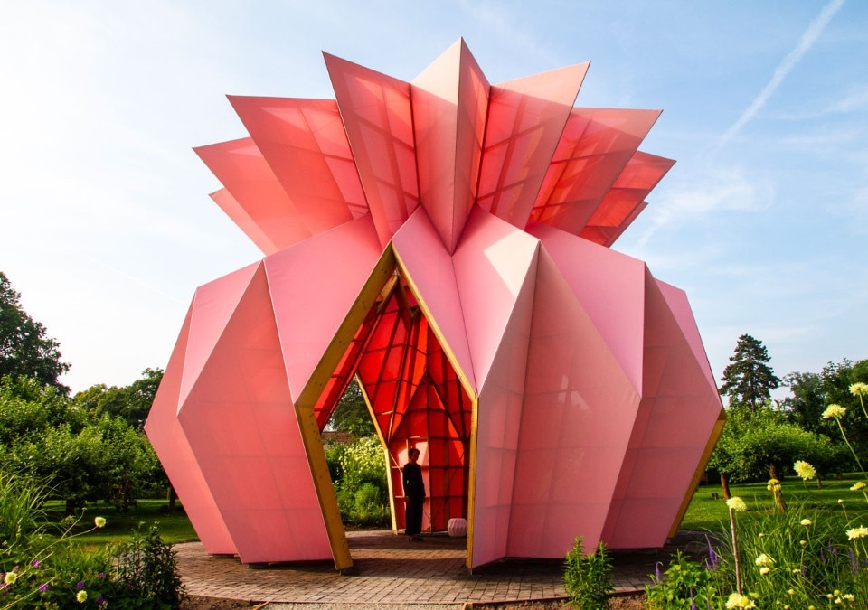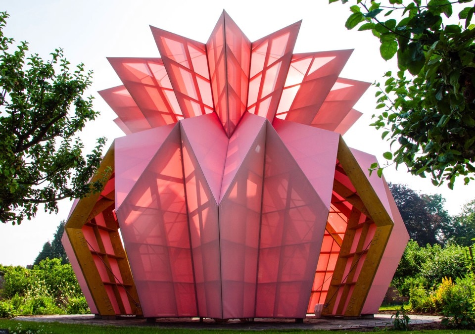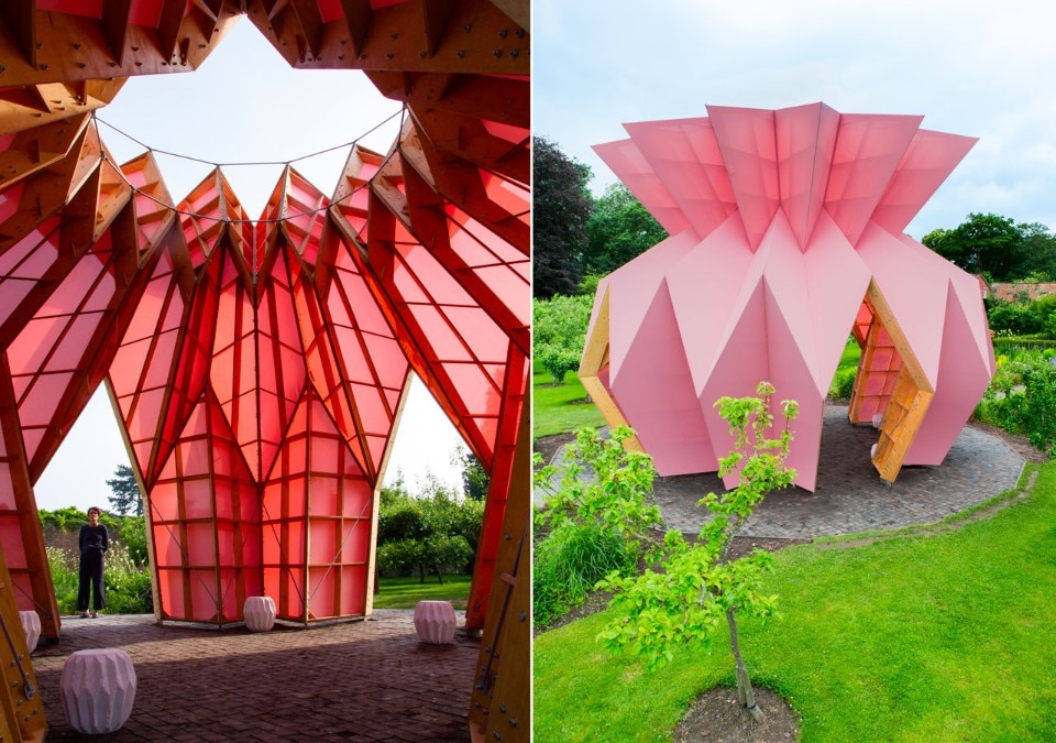 The artists were inspired by the popularity of garden buildings or ‘eye-catchers’ such as these in the Georgian era. The folded form of the structure echoes the geometric shapes found in the interior design of the mansion, and it also bears more than a passing resemblance to a pineapple – inspired by eighteenth-century traditions of importing exotic fruit, particularly pineapples which are thought to have been once grown at Berrington.