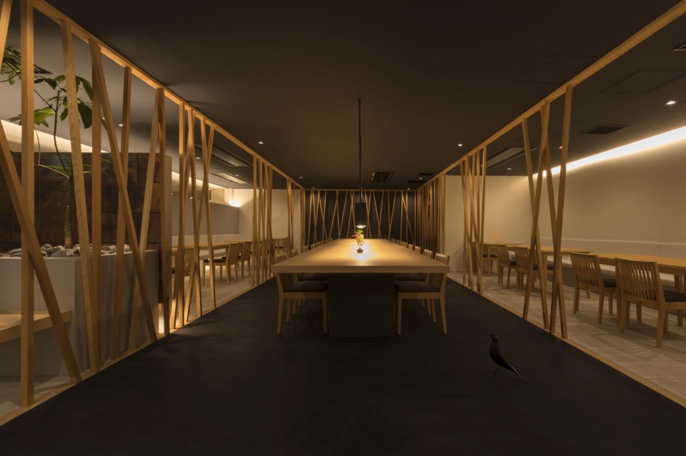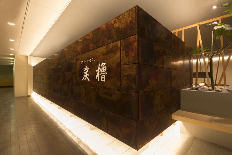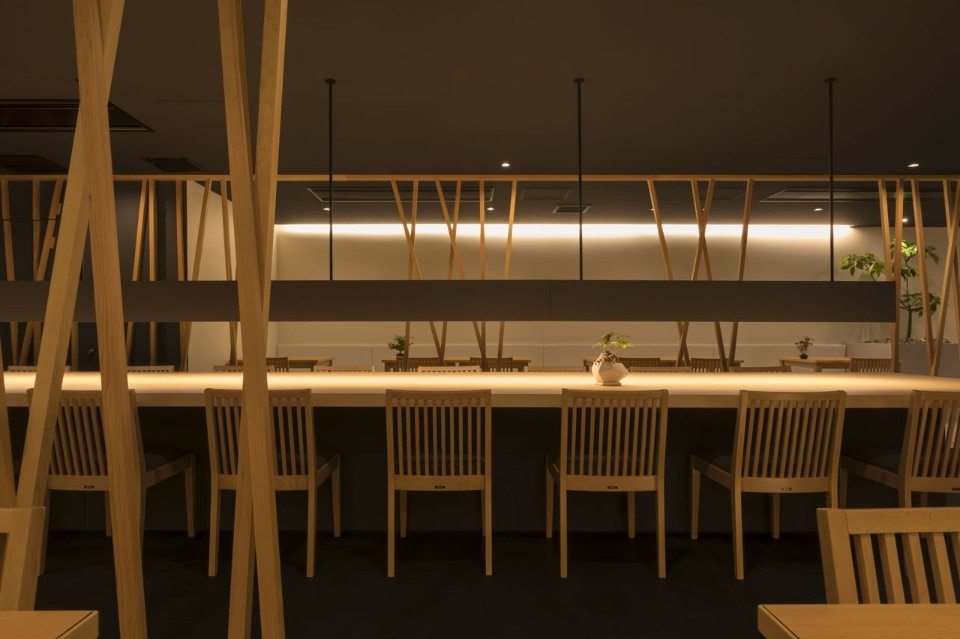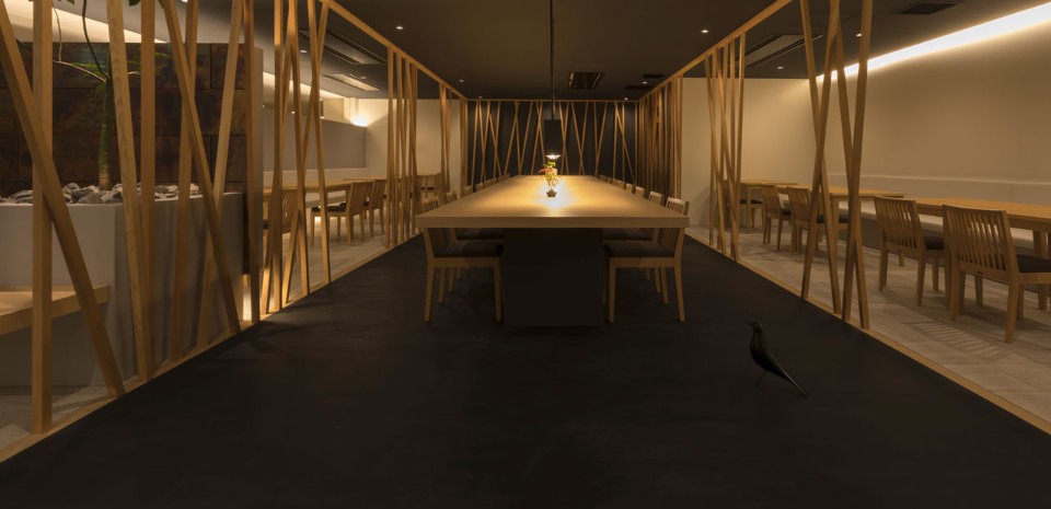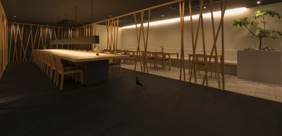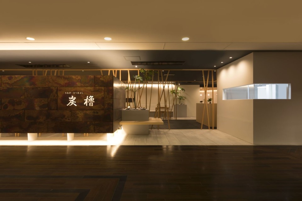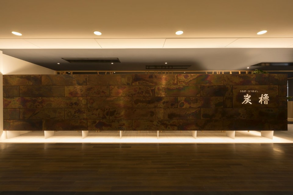 The random arrangement of wooden lattices across the shop space is inspired by tebo, or eel-catching baskets. Ink-dyed mortar is used for the floor to create a cozy atmosphere with the gentle use of black ink. The facade features copper plates. The surfaces of the dyed plates are acid-corroded to express the ever-changing water surface under which eels swim around.