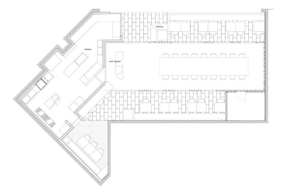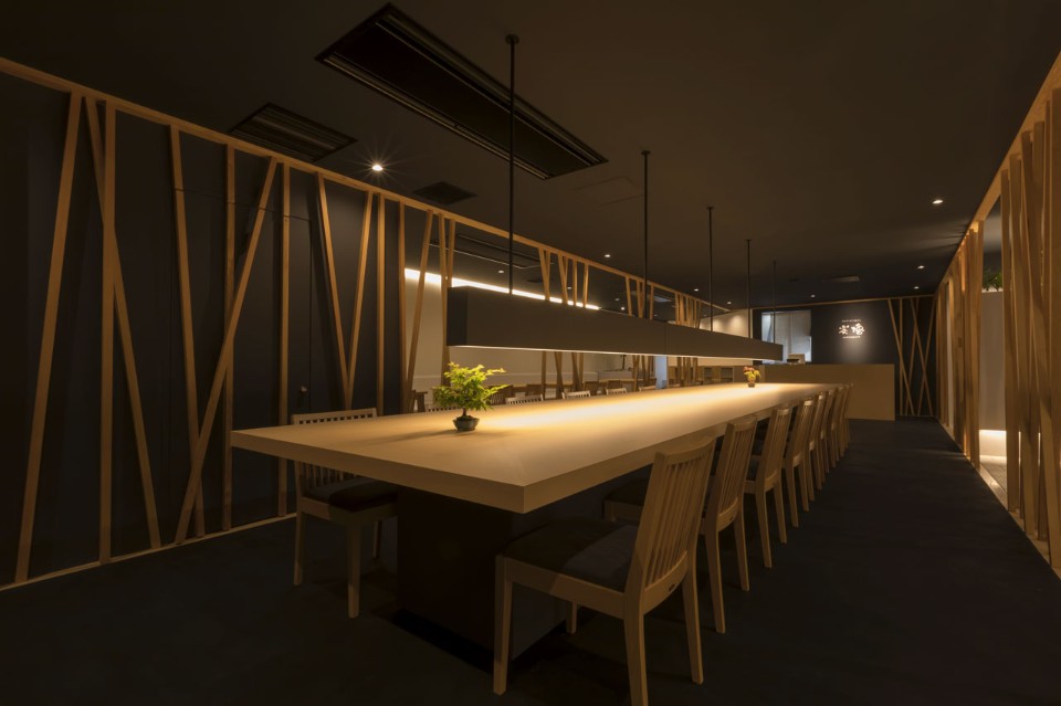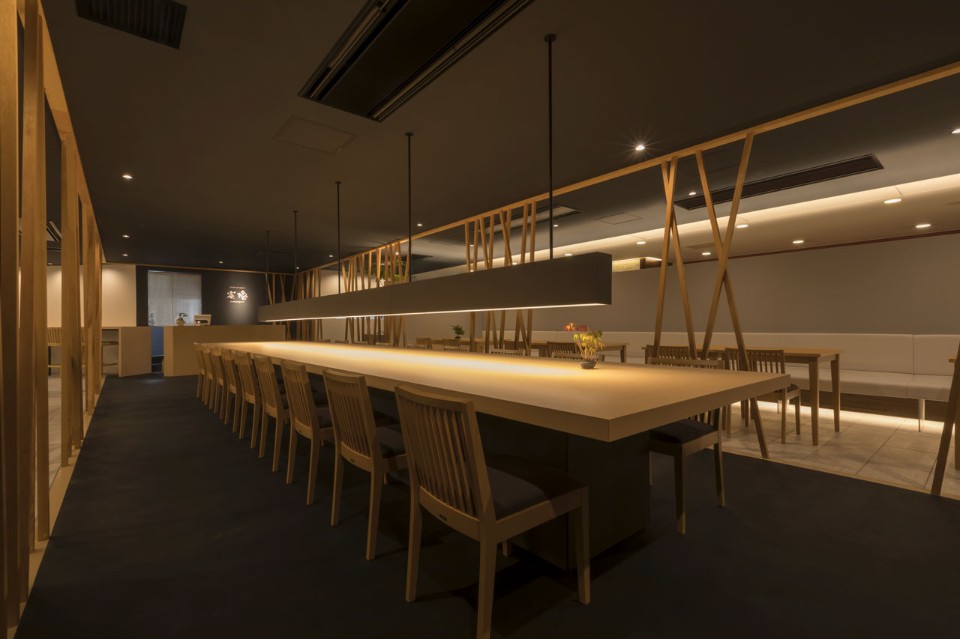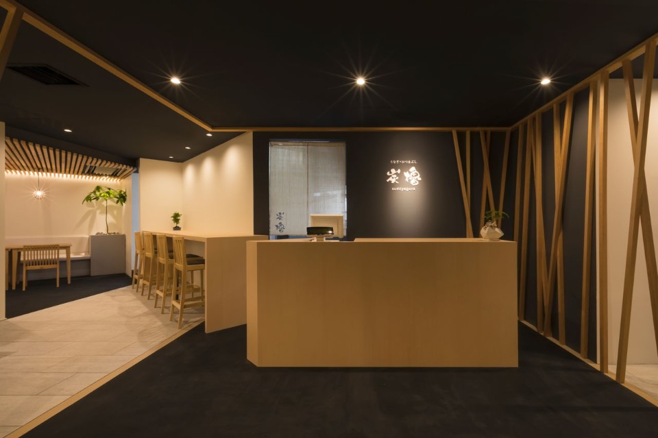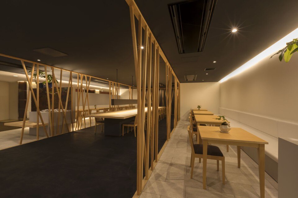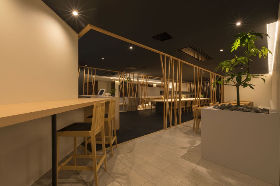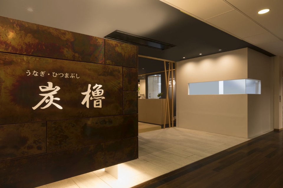 The random arrangement of wooden lattices across the shop space is inspired by tebo, or eel-catching baskets. Ink-dyed mortar is used for the floor to create a cozy atmosphere with the gentle use of black ink. The facade features copper plates. The surfaces of the dyed plates are acid-corroded to express the ever-changing water surface under which eels swim around.