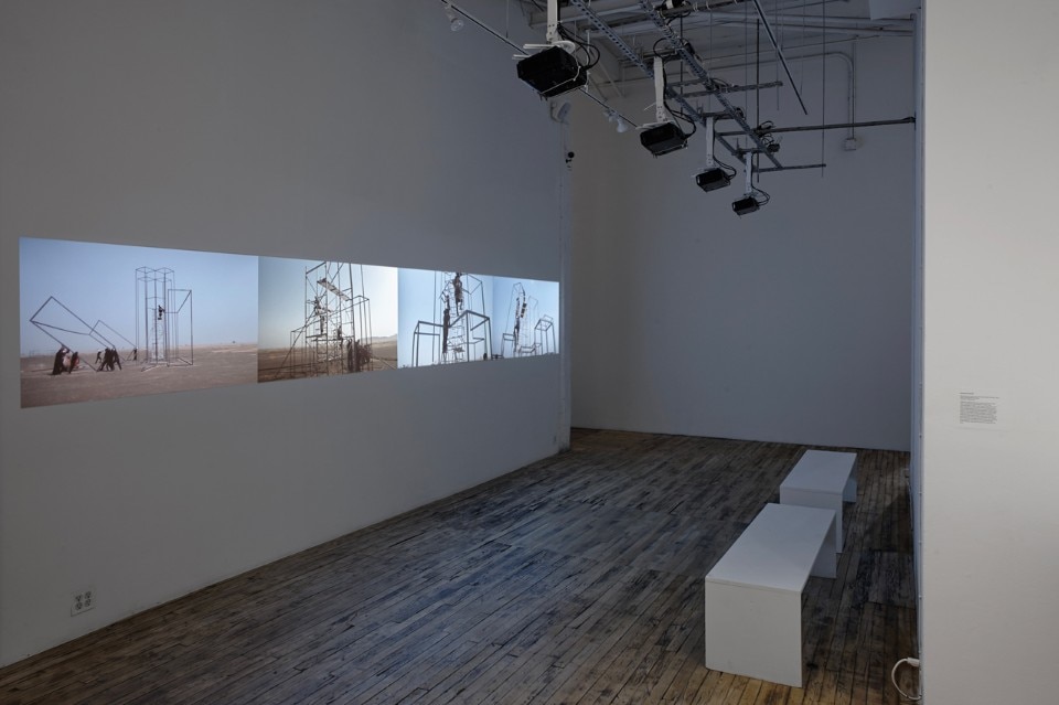 In “A City Called Mirage”, Henda considers the birth, life and death of modern cities. In Paradise Metalic (2014), four synchronized videos together recount the construction of an ideal city built on the barren Maliha Desert in Sharjah. At once land art and performance, a new fictional country is established and subsequently demolished in the sand, hauntingly demarcated by stakes in the ground, concrete walls and iron skeletons of buildings.