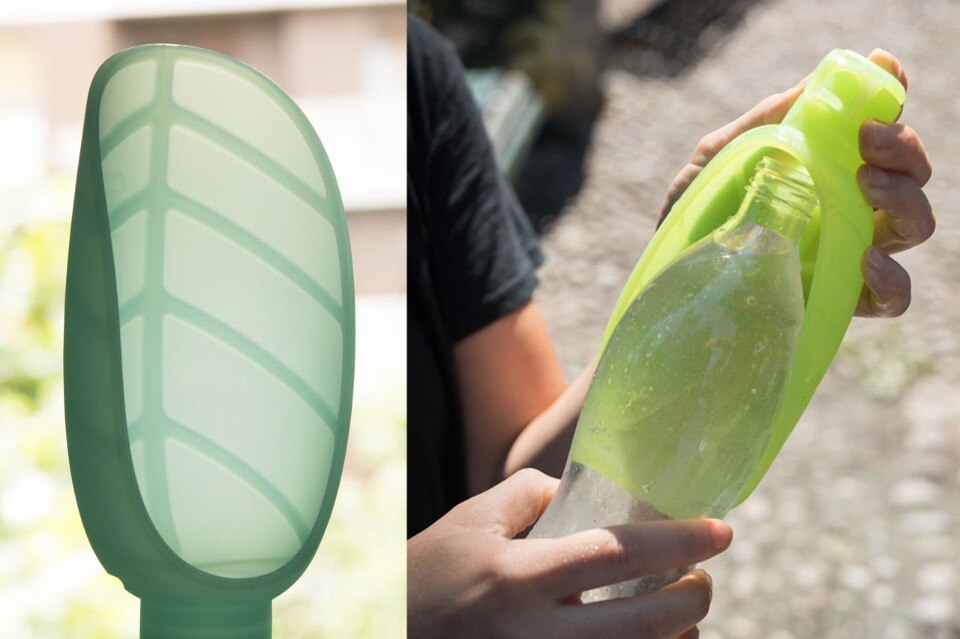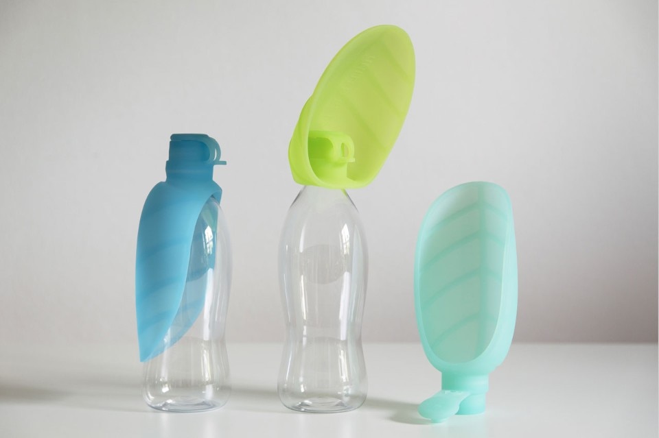 The Leaf is made of non-toxic silicon and fits standard neck PET bottles. The veins structure reinforces the product making it both strong and flexible. The Leaf is extremely easy to use: it can be clipped on top of a bottle and then fold to create a bowl. The water is squeezed out through a membrane, which allows to give as much water as needed. Once finished, it gets closed with an integrated hermetic top and reversed back to enfold the bottle.