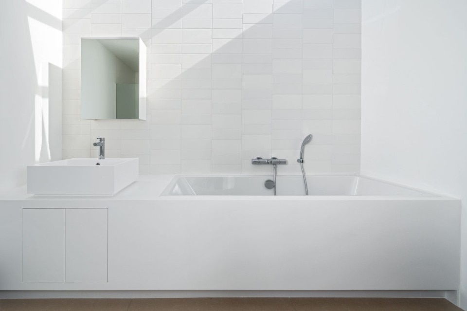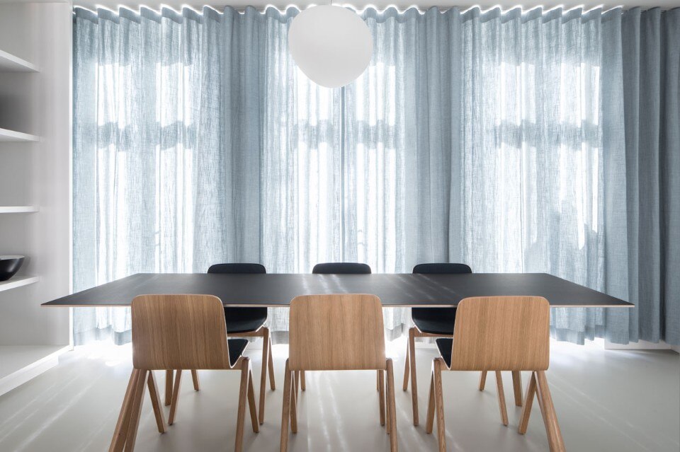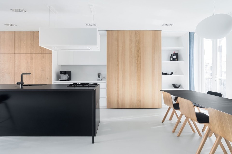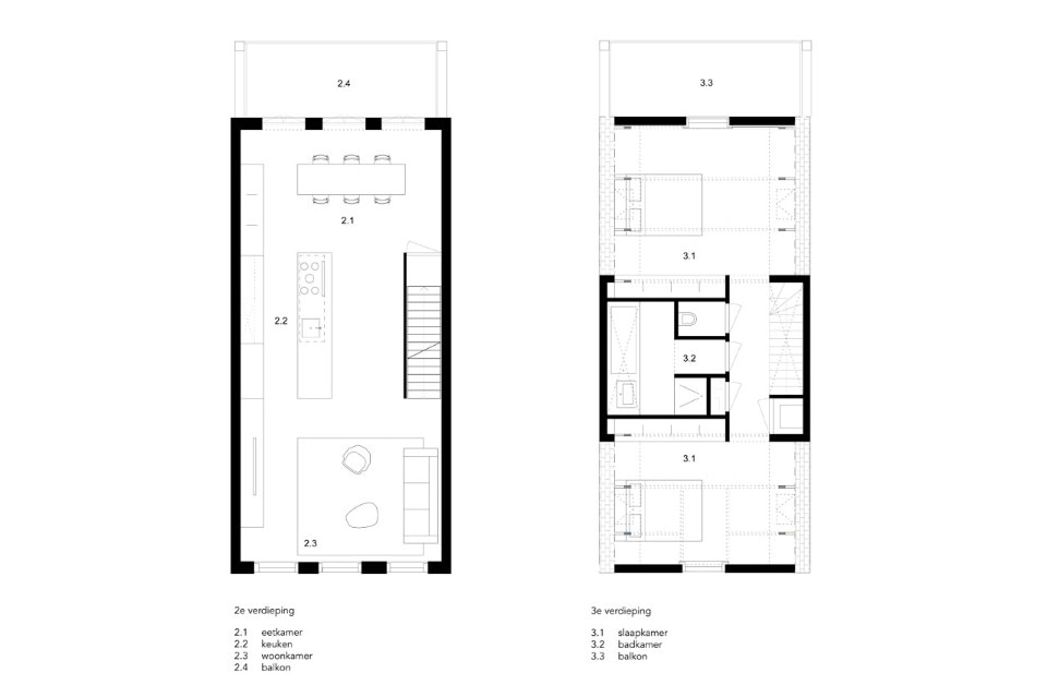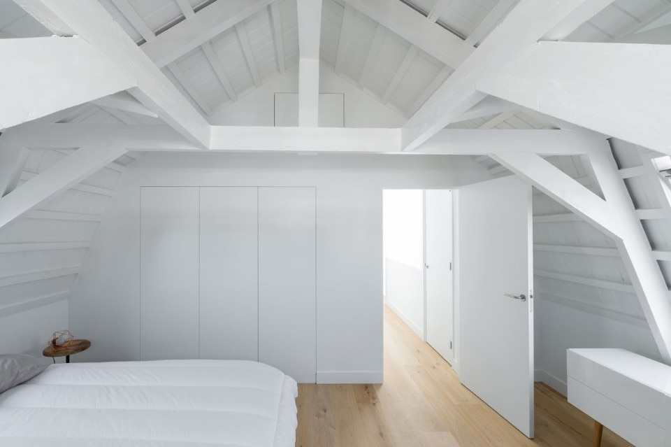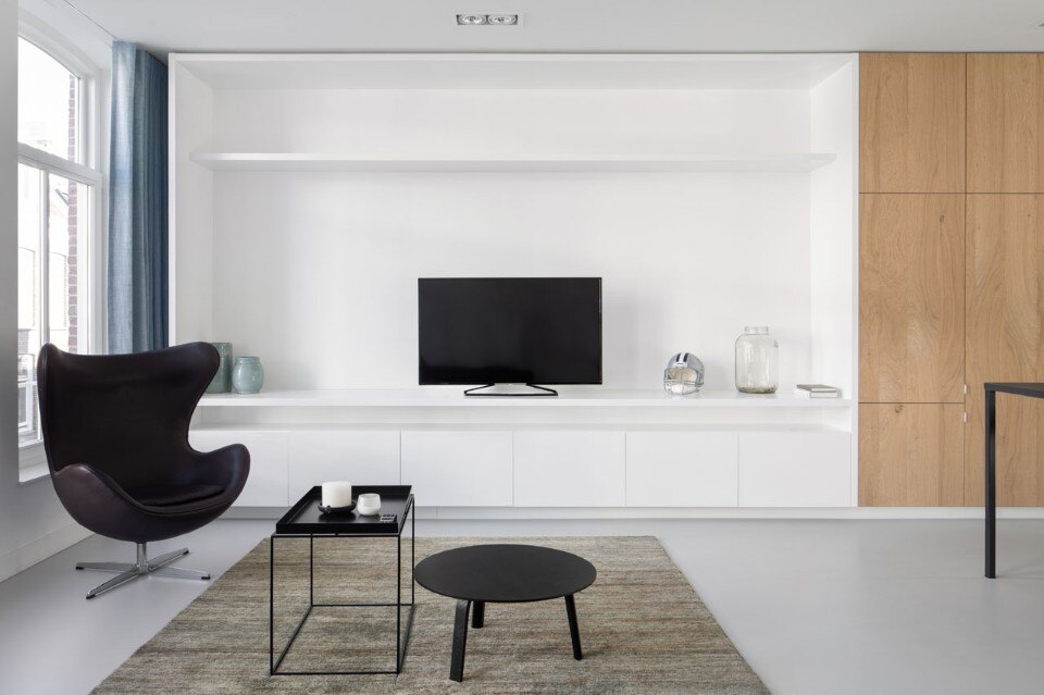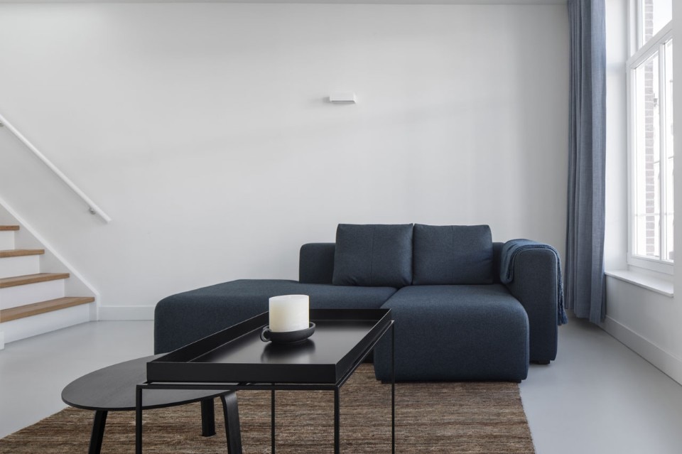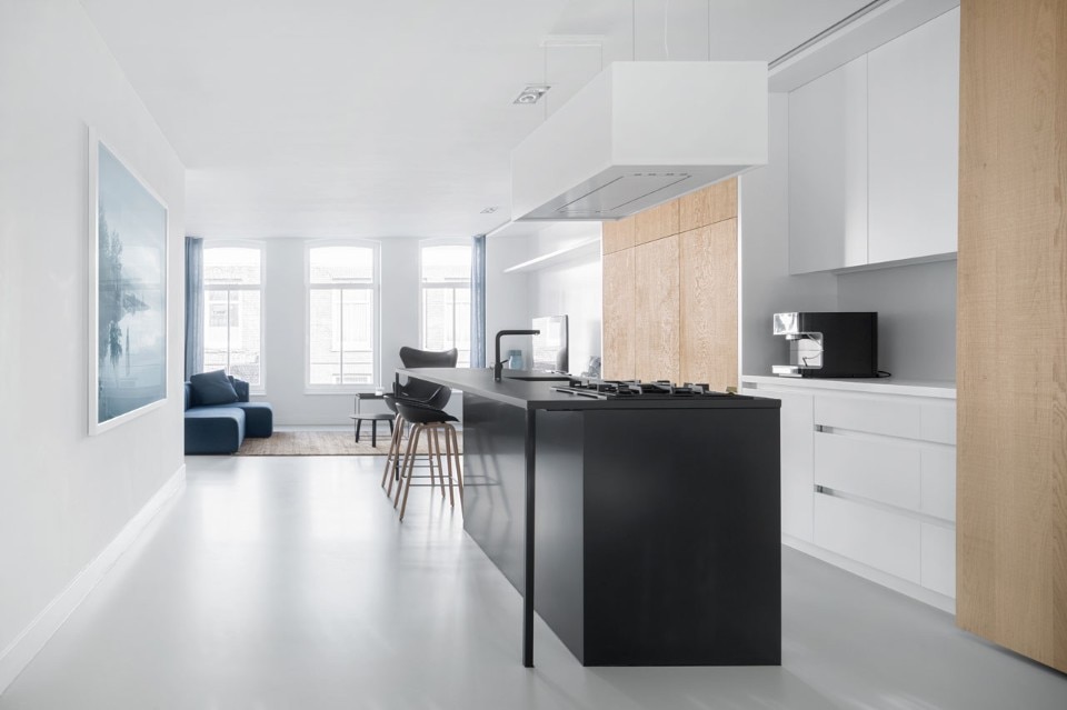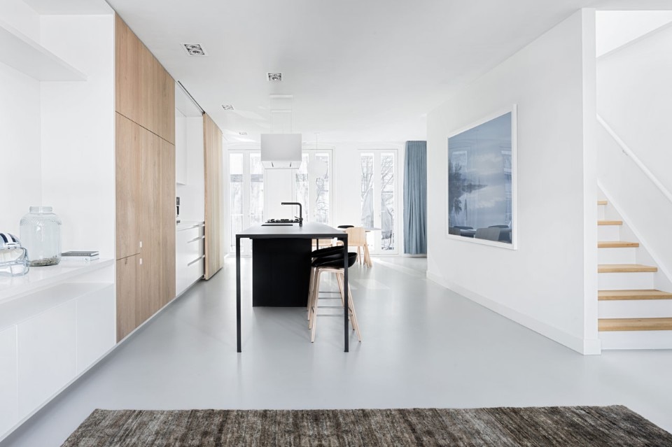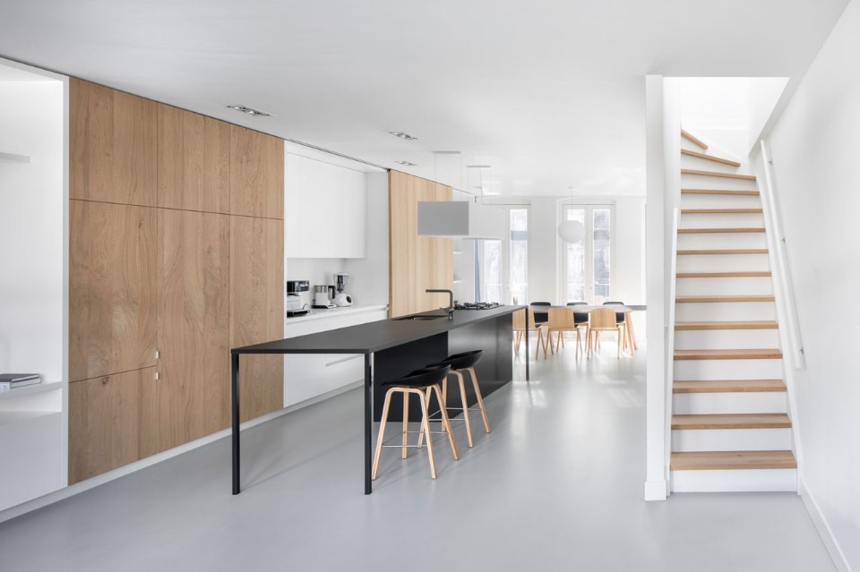 An integrated wall cabinet organizes the living, kitchen and dining area in one large gesture. Several functions have been integrated in this block such as storage space, a television cabinet and a custom designed kitchen which can be hidden behind two large sliding panels. A contrasting black kitchen island combined with a large high table is placed in the middle of the room and divides the space. Furniture in black and dark blue tones are in contrast with the light airy space. The top floor including two bedrooms and a bathroom, is finished in white in combination with the rough oak flooring. New rooflights above the stairs and in the bathroom are made to flood the rooms with natural light. A built-in bath and custom designed sink blends in with the rest of the space.