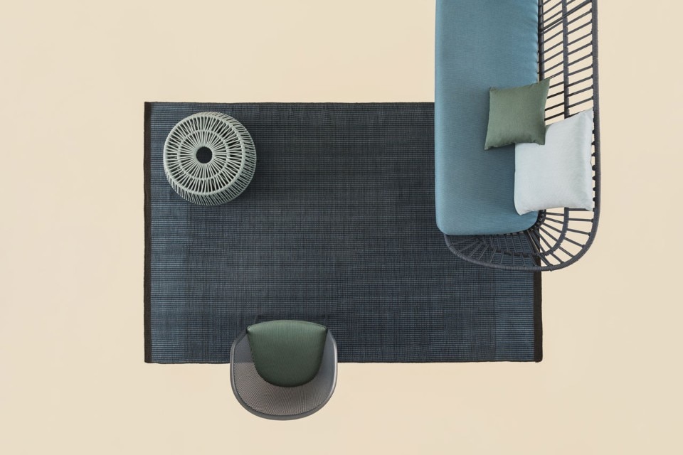 Creative duo Doshi Levien signed a new rug collection for Kettal, designed to enrich the outdoor living. Developed by following an abstract theme, Geometrics explore the interaction between lines and solids on one side, and colours found in different natural landscapes on the other. Rugs are available in two different sizes, 2x3 meters and 3x4 meters. Straight lines overlap a plain background giving more spatial depth, and small rectangular shapes and colour blocks create a dynamic effect. They become one with the outdoor landscape – be it a wellbeing retreat, a wild mediterranean garden or a deep sea – mixing soft colours.