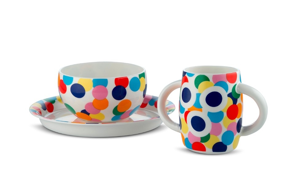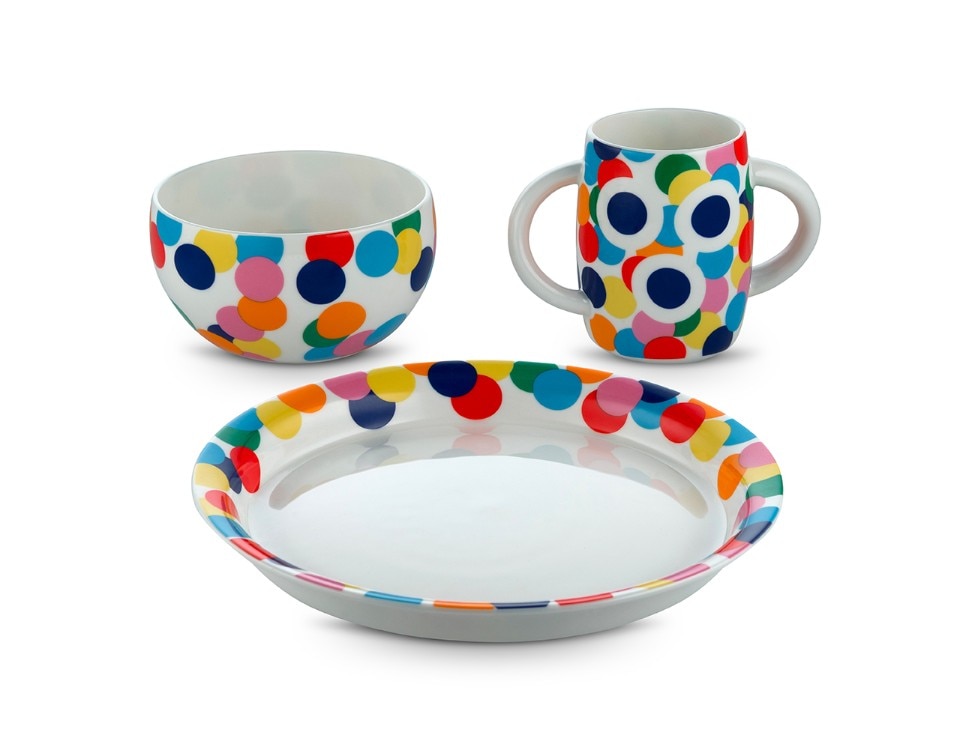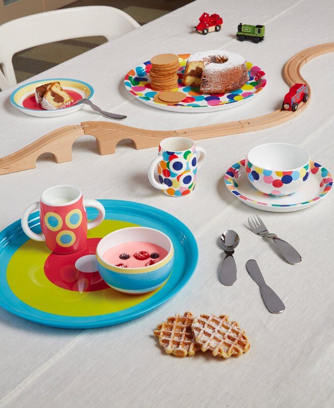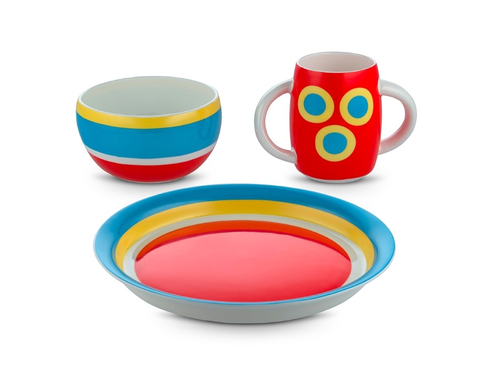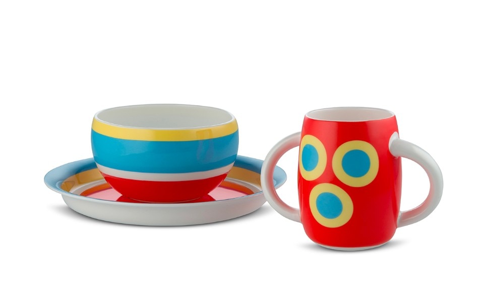 Concentric lines, colors, Proust decoration: these are the elements of the children's table set designed by Alessandro Mendini for Alessi to accompany the little ones to discover the mise en place. Alberto Alessi writes: “The idea of entrusting Alessandro Mendini with the theme of table service for children was due to a sort of logic of opposites: Sandro, in addition to being my beloved and unreachable master, is in fact the oldest among the authors Alessi in activity and I came to think that it would be nice to see him take in the child's hand and completely unusual for him”. The service consists of a plate, bowl and glass in fine bone china, stainless steel tableware and a round melamine tray.