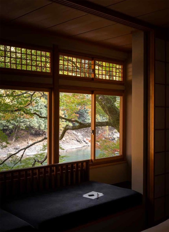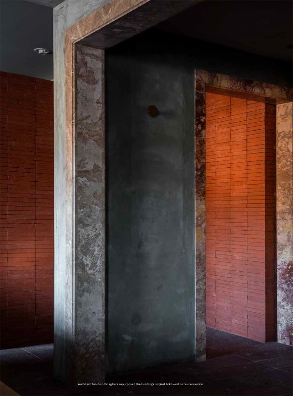The color scheme for the penthouse in Bijuu Residence began with what was already there: red bricks that were unearthed during the renovations of this former family home and that, when con- trasted against the suite’s darker, inky hues—and the cloudy Kyoto sky—o er its guests a fiery warmth.