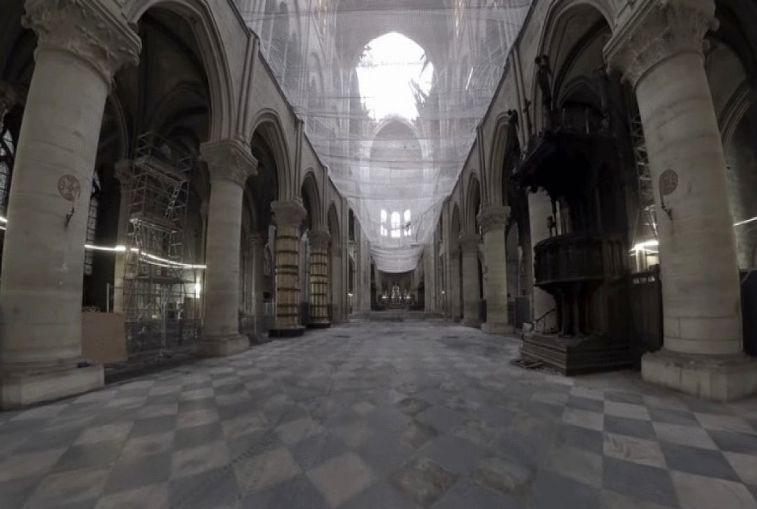 This sixteen-minute experience takes you around the cathedral, reconstructing the terrible fire of last April, showing superimposed images of the past life and the present emptiness of the cathedral. “When we filmed at Notre Dame a year ago, we never thought that the footage would become a historical document so quickly” says Rochereuil. The most important element of the documentary is certainly the huge amount of informative material on the current situation of the interiors of the cathedral, with the reinforcing elements that were placed to support the pillars and the many pipes above the church, right where the spire designed by Eugène Viollet-le-Duc collapsed. The crater that has replaced the floor of the cathedral is an open wound, the abyss in front of which the spectator equipped with a VR helmet finds himself. Only the pipe organ was spared from the fire, but is now surrounded by dirt, garbage, and fast food drink cups.