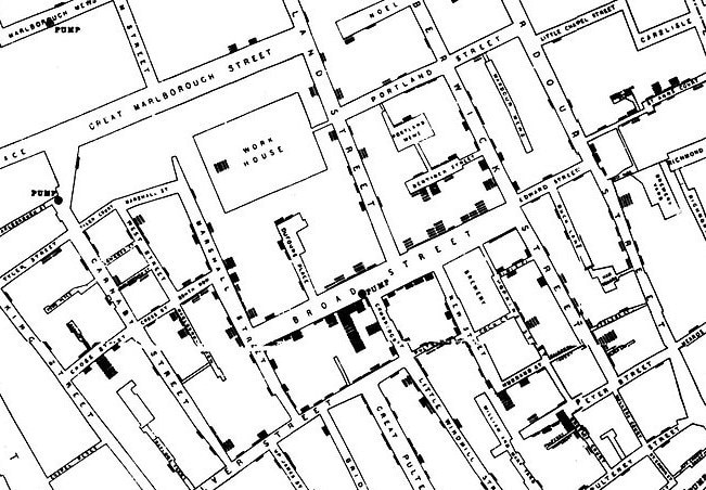 In 1854, London was the largest metropolis in the world, and it was struck with a severe cholera outbreak. Many neighborhoods were overcrowded, the city wasn't prepared, and the hygienic conditions were very poor. This was the price to pay for the Industrial Revolution. Soho wasn't the gay-friendly neighborhood full of nightlife, pubs and sex shops that we all know today, but an overcrowded hell in which cesspools were constantly overrunning. So, the government decided to dump the waste into the River Thames. The result was a health disaster, but the cause was not understood at the time. It was the contaminated water that spread the cholera, but the thesis advanced by London physicians - in line with the science of the time - was that the spread of the disease was being caused by 'miasma', some kind of air-borne poisonous exhalations. Therefore, the citizens continued to drink the contaminated water, and became increasingly ill.