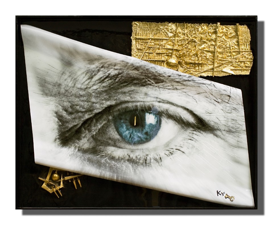 Arnaldo Pomodoro, 102 x 82 cm, Work in relief on canvas and resin paper, with the insertion of two fragments of gold resin