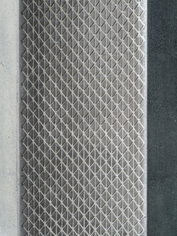 The bench consists of sixteen strips of green painted wood with a backrest and a galvanized steel structure. A concrete base is laid to which the bench is then anchored with screws and bolts.