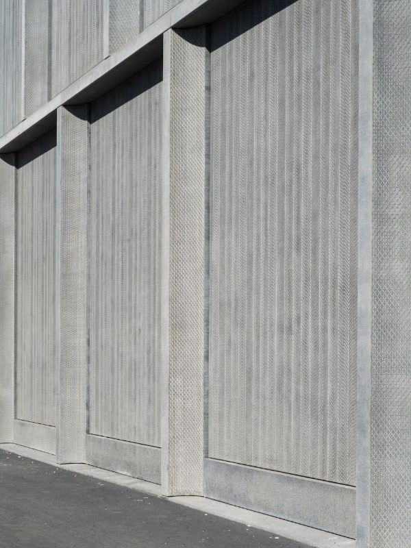 A triangular fountain that flows into a large basin and a horizontal cut that allows a glimpse of the Via dei Girdini, draw the mute side of the volume.