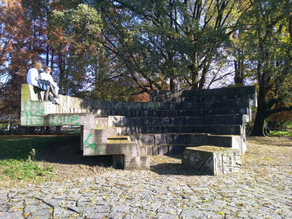 Music Accumulation and Sitting was created in 1973, on the occasion of the XV Triennale di Milano, as part of the project "Contact Art-City" which aimed to involve the citizens through a new usability of works of art. Arman Pierre Fernández created a small theatre: irons emerge from the concrete and draw profiles of chairs all different from each other in style and form. The iron from the reinforcement material of the concrete becomes an element of ornament and identity of each seat. From the base of the conductor's podium, on the other hand, emerge moulds of trumpets, clarinets and other musical instruments.