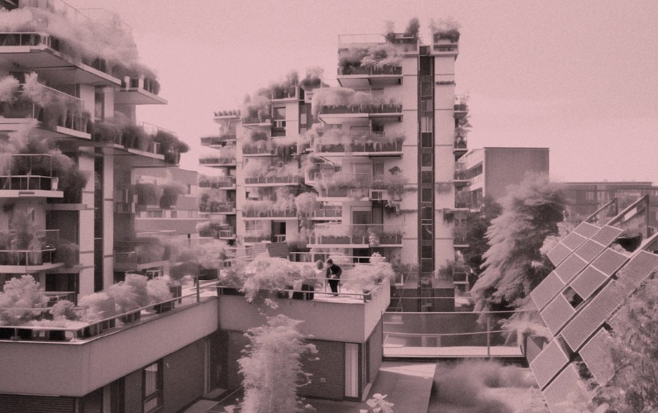The second story reflects on how homes can foster our sense of identity and togetherness without alienating distinct communities from one another. Angela, living in a women-only housing cluster in Massachusetts, USA, aims for total self-sufficiency. They have designed a central workspace, called the “She Shed”, where they can repair any object. In the She Shed, continuous knowledge and experience exchange takes place. Angela, who attended a technical school, will teach others how to weld, while Patricia is learning to administer emergency medical treatments to strengthen the group and cope more effectively with climate change. Angela and Patricia also make eco-friendly choices in interior design, opting for sustainable solutions like bio-solar wallpaper that uses algae to generate electricity from sunlight, inspired by patterns from the 2000s.
