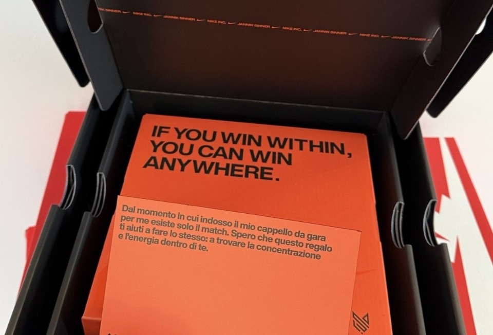 The cap was delivered in uniquely designed packaging, consisting of three black boxes, one inside the other. Each box contained motivational phrases, such as ‘The work you do on the inside will make you unstoppable on the outside’, culminating in a final message from Sinner printed on a card: ‘From the moment I wear my match hat, only the match exists for me. I hope this gift helps you to do the same: to find the focus and energy within yourself'.