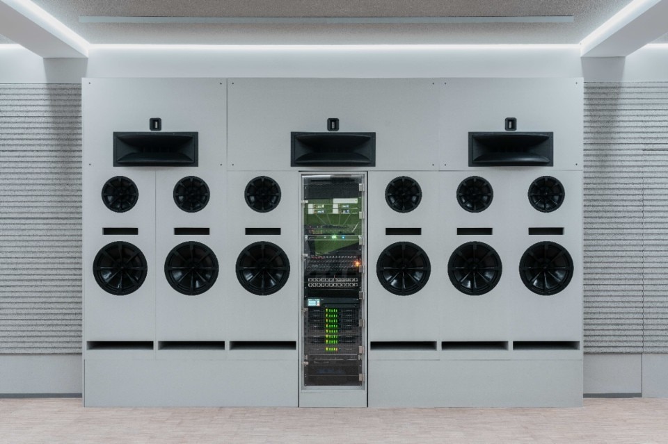 “A giant brain wrapped in kilometers of cables,” Antonelli explains. The space was designed as a sound machine, where every element contributes to the listening experience.