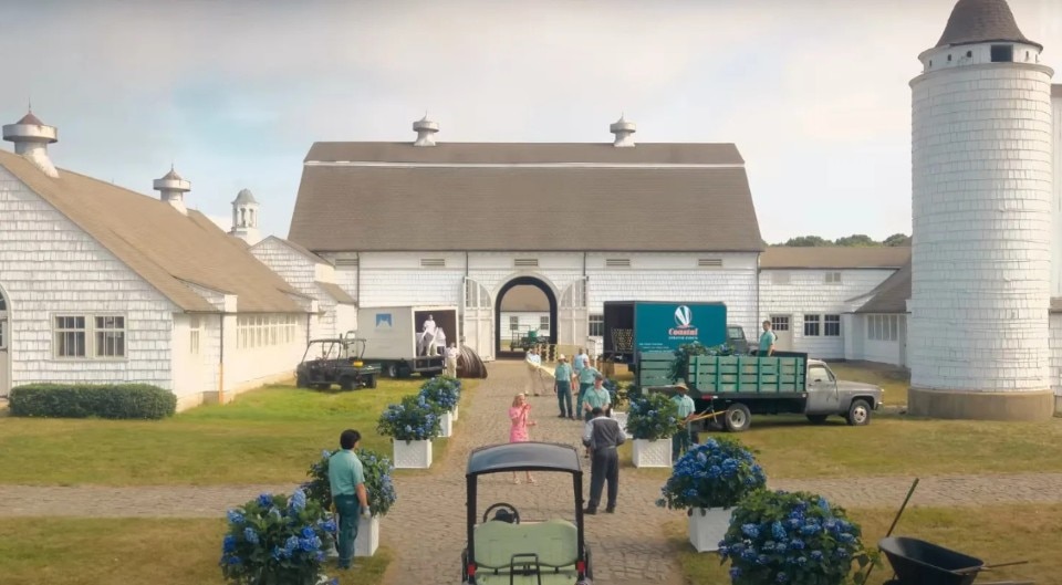 The mansion, too, takes center stage. Inspired by the real Caumsett State Historic Park Reserve on Long Island, and renamed “Cliff House” for the series, it becomes the symbolic and visual anchor of the entire narrative. Digitally transformed, the house blends classic colonial elements with quirky “oligarch mansion” flourishes, dominating the coastal landscape and reflecting the series’ dual tone: a dreamlike place that feels too perfect to be real. Perched on a cliff on the fictional island of Port Haven, the mansion is accessed via a long, perforated metal staircase rising from the private dock. With its tower featuring a circular panoramic balcony and an infinity pool overlooking the sea, the house merges the elegance of a historic 1920s mansion with modern architectural touches designed to emphasize its grandeur. The set design integrates the panoramic tower and places a giant ornamental anchor in the gardens.