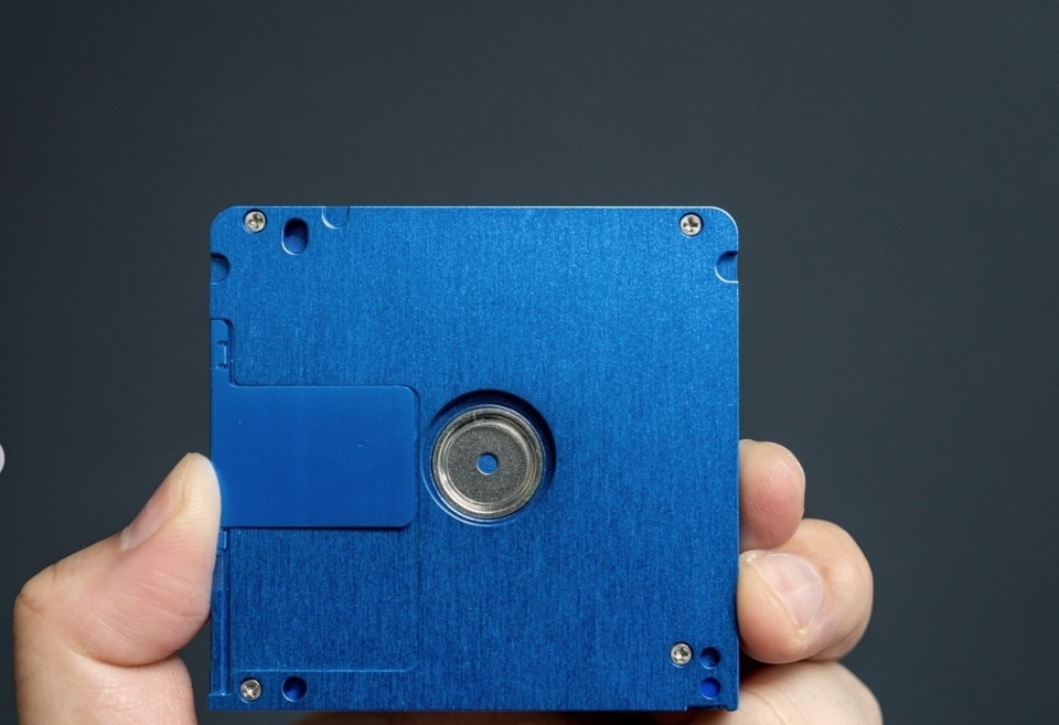 Each design change required new prototypes—including a gold version, and finally a blue one tested at the beginning of 2025. This final stage introduced micro-functional details: filleted edges around screw holes to avoid snagging, and a new notch to improve access to the write-protect tab. Over multiple tests with specialist suppliers in China, every element was refined to create a fully functional, beautifully crafted disc. The final version—made from 6061 billet aluminum and anodized in five colors—strikes a balance between engineering precision and reverence for the original format. If used correctly, it could last forever.