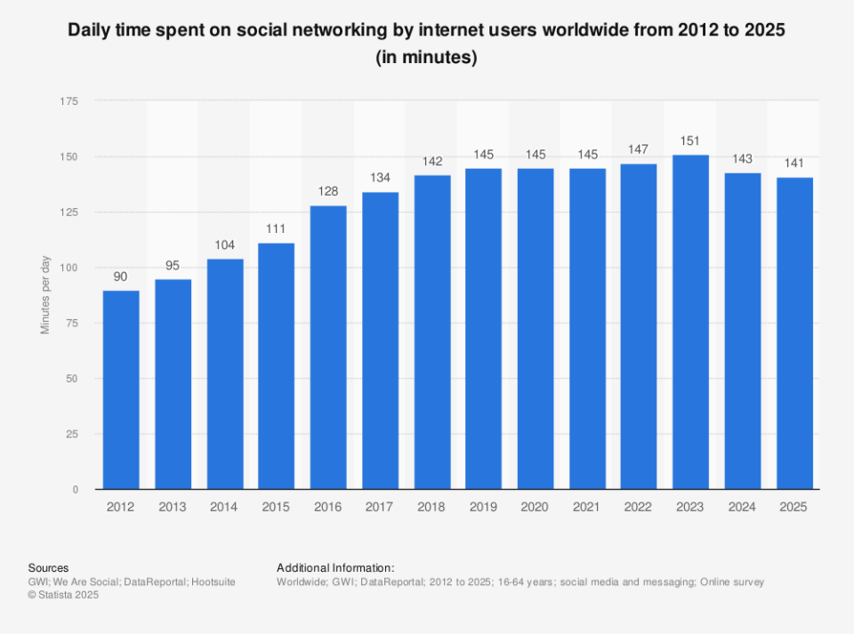 The most significant data, however, concerns time spent — the metric platforms care about most. According to research by GWI based on 250,000 users across 50 countries, daily time spent on social media has been declining since 2022, when it reached 151 minutes per day, falling to 143 the following year and 141 in 2024.