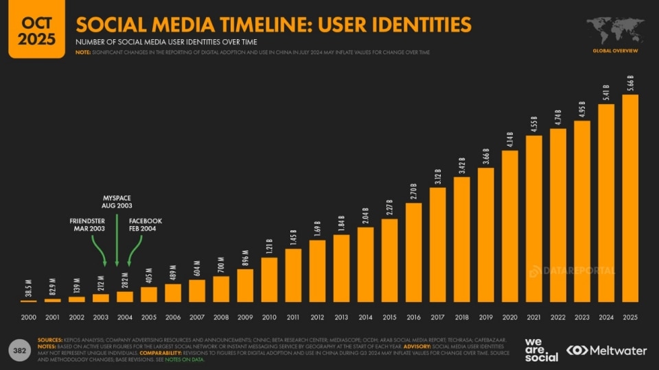 Participation is declining, but social media hasn’t been abandoned. By the end of 2025, active users across Facebook, Instagram, TikTok, and X reached a record 5.6 billion — nearly everyone connected to the internet worldwide (duplicate accounts and bots aside).