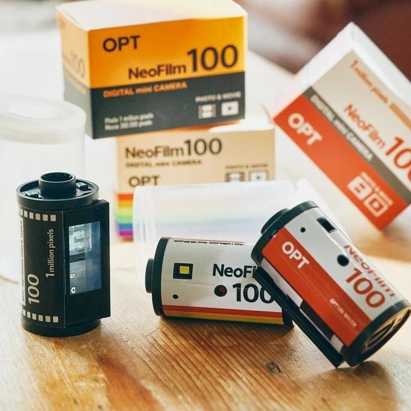 From Japan comes the OPT100 Neo Film by Opt!: a tiny digital camera housed in a body identical to a traditional 35mm film cartridge. Extremely compact and fully pocketable — measuring just 4.7 × 2.5 × 2.5 cm — it features a color display, a 1-megapixel sensor capable of capturing images up to 3,760 × 2,128 pixels, and 0.3-megapixel video recording.