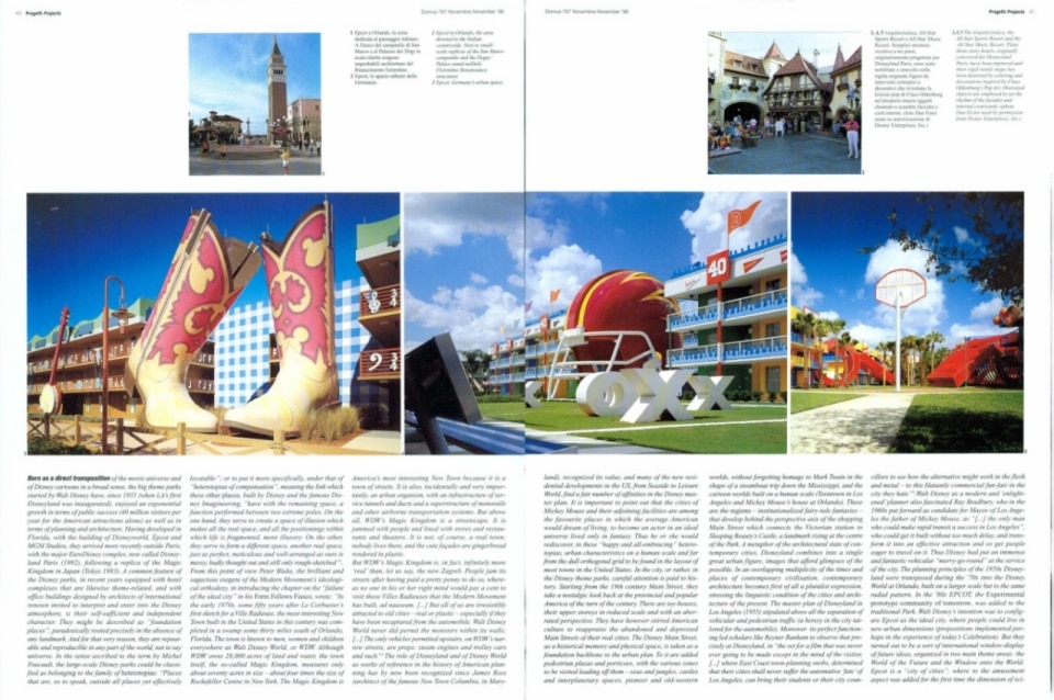 Then come spectacle, advertising, the total vaporization of boundaries between reality and fantasy through the language of consumerism: “Disneyland makes it clear that within its magical enclosure fantasy is absolutely reproduced, in a world more real than the real”. Here is Eco, quoted exactly where one might expect, in Domus issue no. 787 (November 1996), edited by François Burkhardt and devoted to the “Disney syndrome”, to the Disney linguistic galaxy as an agent transforming our living space, including through the architecture with which we fill it. The story unfolds through buildings by Frank Gehry, Arata Isozaki, Robert A. M. Stern, and the duo Robert Venturi and Denise Scott Brown.