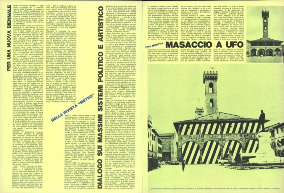 As Italy is perceived as a vast province unto itself, Eco travels through it, and Domus follows him, into every pop-up, even the ones that more are more boiling with harsh debate, where the philosopher plays a central role. As in the provocations of the radical Florentine group UFO, who in 1967 hacked the Masaccio Prize in San Giovanni Valdarno and “unleashed” – or hosted – debates coordinated by Eco himself. Evolutions would also include separations, like UFO themselves would do a few years later, distancing their stance from Eco the Freudian father (despite rebranding him as “uncle”).