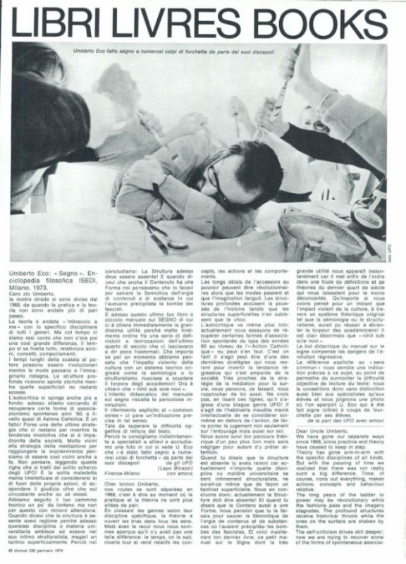 Eco stands among them, though rather than a mere “quote generator”, he often assumes the role of legitimizing father, whether to be praised or symbolically slain, as the members of Italian radical design group UFO would metaphorically and Freudianly attempt (a truly twentieth-century story).