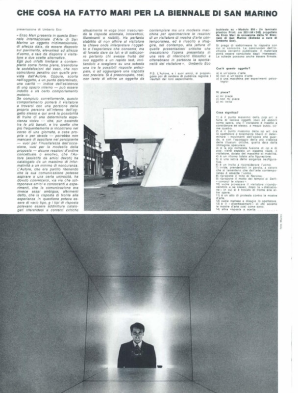 The Umberto Eco introducing Enzo Mari for his 1967 work at the San Marino Biennale is also the only Umberto Eco we see speaking directly in the pages of Domus, and it takes the form of a survey, a poll. “The Author, who had initially believed his communication might aspire to a certain univocality, gradually had to convince himself, as he subjected friends and acquaintances to experiments, (…) that responses to the experience in question could vary widely, and that types of response could even be catalogued according to critical currents now in vogue (not neglecting anomalous, innovative, illuminating, or laughable answers)”.