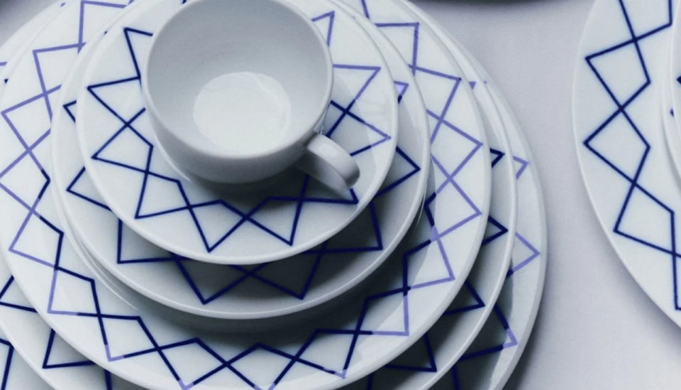 The Beautiful Table-in addition to the all-white one-also has a version decorated with a cobalt blue mark. The "My beautiful China" decoration is a tribute by Sottsass, a great traveler and lover of the Orient, to Chinese decorated porcelain vessels. The feature that characterizes his plates is a schematic interlocking that yields to the rigor of geometry by fading slightly during the second glaze firing: this factory "flaw" appealed to the designer, who wanted to keep it, considering it an essential production element.