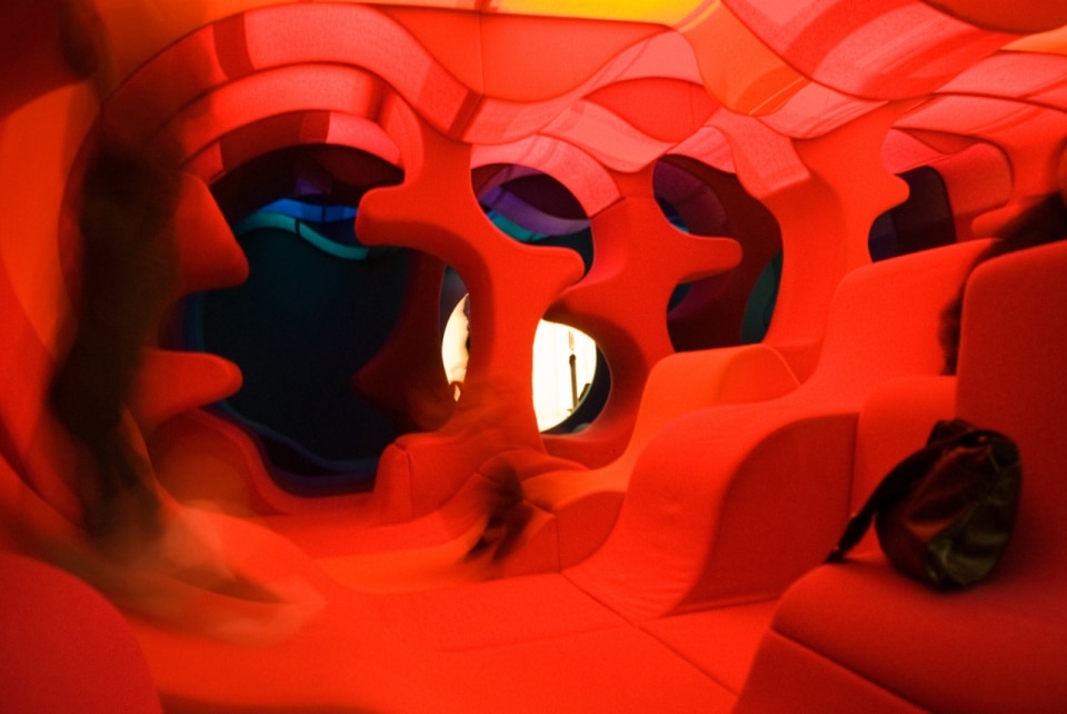 In this cavern it is difficult to say what is floor, what is ceiling, what is lamp, what is furniture, what is for sitting, what is for walking, what is for one person, what is for two, what is for more. It is a space that is futuristic and alien, but also primitive and ancestral, looking like an open tunnel in the atmosphere of a distant galaxy but also like the inside of a mother's womb. Some of the furnishings, developed in a few months for this occasion, will later be adapted for industrial production and put on the market. These include, for example, the famous Living Tower.