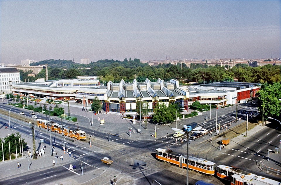 To walk Landsberger Allee is an exercise in urban archaeology. We start at Platz der Vereinten Nationen, once known as Leninplatz: before 1991 it was home to a colossal Lenin statue carved from Ukrainian red granite, today replaced by a monumental fountain marking the void of an inconvenient absence. We pass alongside Volkspark Friedrichshain with its artificial hill built from Second World War rubble, walk past the Friedhof der Märzgefallenen – the cemetery of the martyrs of the failed revolutions of 1848 and 1918 – and at the intersection with Petersburger Strasse we finally catch sight of the skeleton of a peculiar building, abandoned for years.