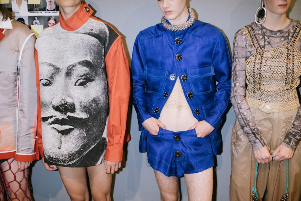 The fashion show-events brought forth other stories, and the models appeared as materialisations of a story, an account, a picture or a sculpture. MSGM by Massimo Giorgetti presented coloured bandanas and floral shirts illuminated by the light reflected off a video-swimming pool, immediately conjuring up images of A Bigger Splash in which the imagination of David Hockney was blended with scenes from the film of the same name by Luca Guadagnino. The duo Pronounce, guests of the special event Guest Nation China, filled the spaces of the Dogana with a parade of models, some of which wore dresses with prints depicting sculptures from the Xi’an terracotta army.