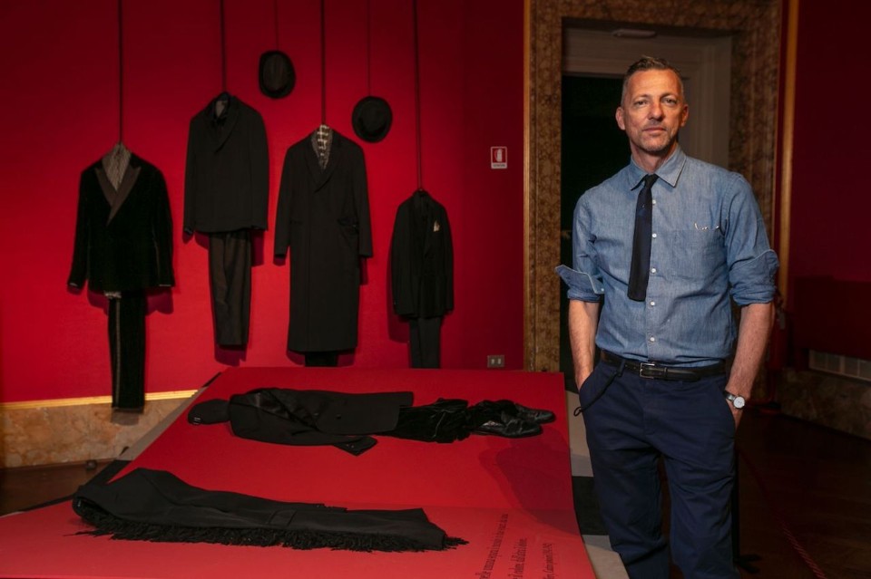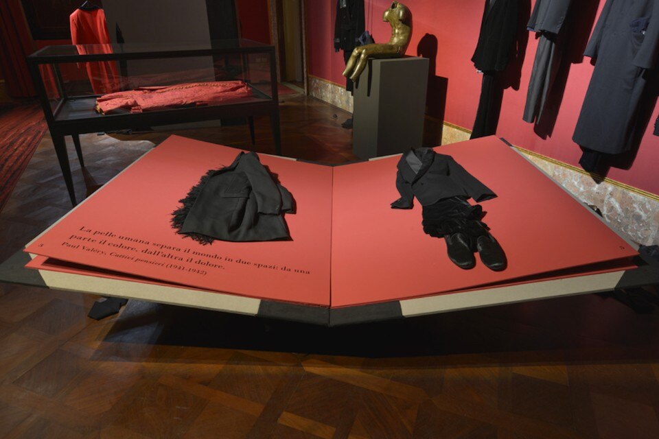 At the Museum of Costume and Fashion at the Pitti Palace, the exhibition A short novel on men’s fashion curated by Olivier Saillard is conceived as a single book that opens, revealing clothes that are not worn, but rather are laid out on huge cardboard pages. The body of the clothing as an object in itself that does not require a figure to wear it is a distinctive trait of Saillard and the male portraits in the Gallery of Modern Art in the Pitti Palace play on these fabric spectres.