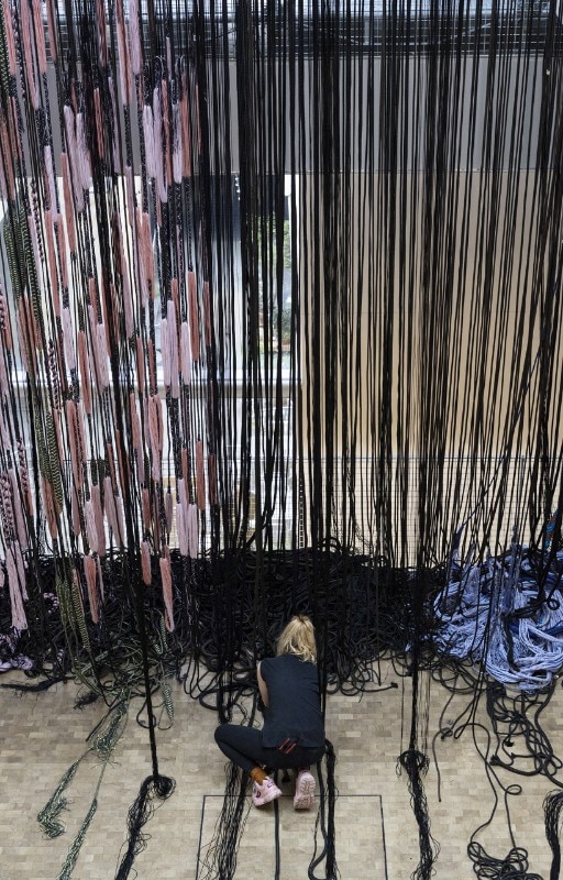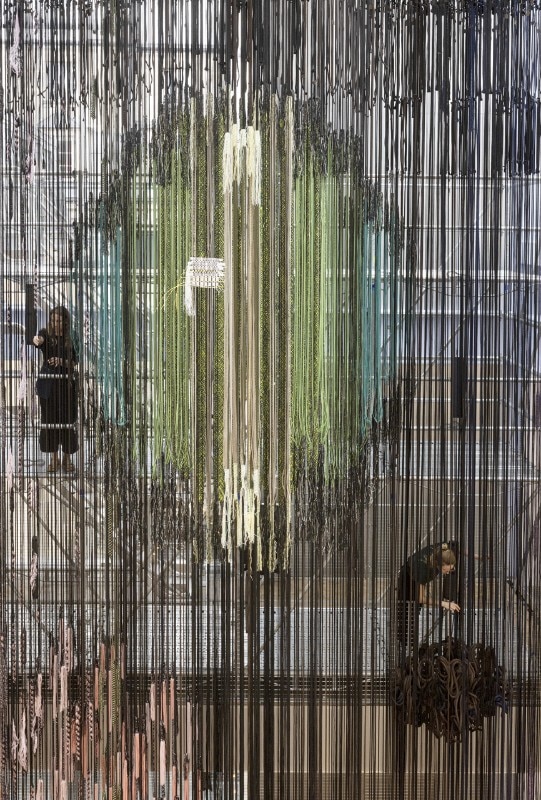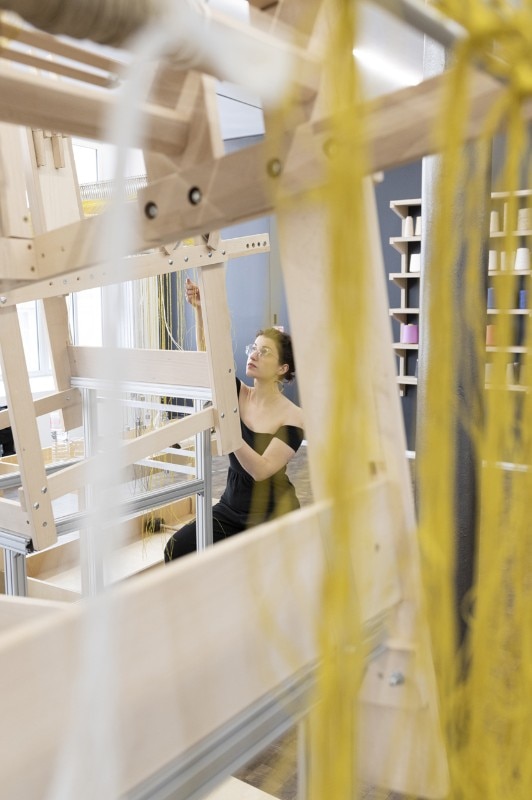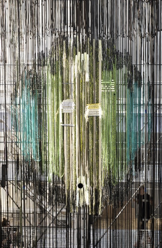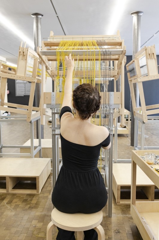 Two areas, respectively dedicated to three-dimensional and digital weaving, with three looms developed for the occasion. The first, Space Loom, is the biggest one and takes up the central space of the entire gallery with yarn more than 16 metres long. On the first floor, the Seamless Loom – made up of four looms that are cut and joined together – allows for the creation of true three-dimensional textile “tiles”: interlocking spheres, objects, volumes and models. On the second floor, finally, Digital Jacquard Loom is the high-tech loom that uses software like Photoshop to generate patterns the weaver may, if he so chooses, create himself, with the chance of changing yarn and adapting the design during the weaving process.