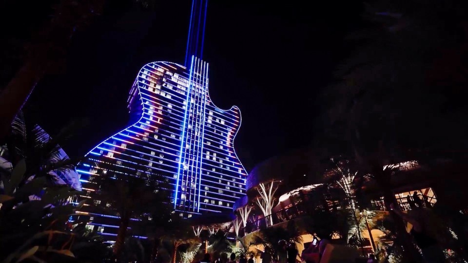 The Seminole Hard Rock Hotel & Casino in Hollywood, Florida, is a guitar-shaped building recently inaugurated, one of the entertainment properties of Hard Rock around the world. Designed by Steve Peck, the 122-meter-high structure is a dynamic sculpture cladded with glass and 16,800 V-Sticks (video fixtures using high-performance LEDs) changing colours, speeds and patters during musical showcases. Float4, an award-winning creative agency specialized in the integration of digital experiences into physical space, designed the digital light spectacle for the opening in collaboration with DCL, a fabricator of architectural specialties including integrated digital media and custom signage.