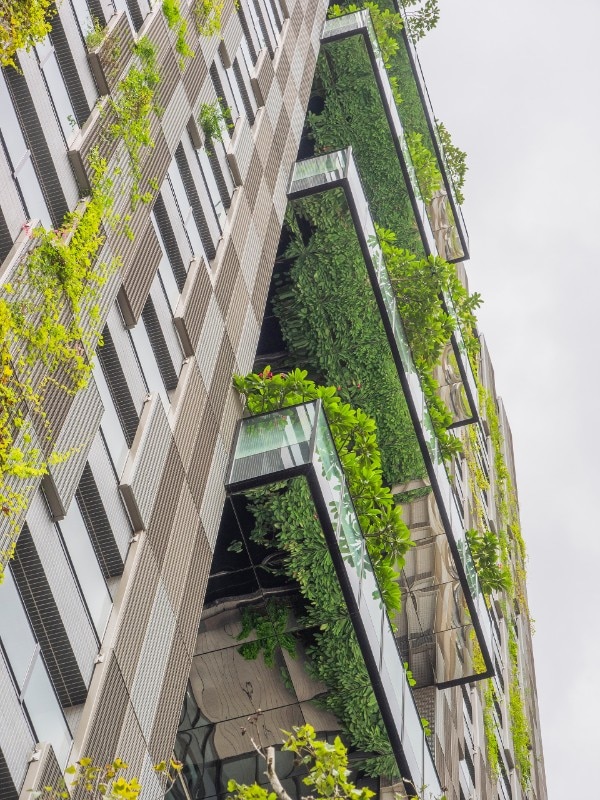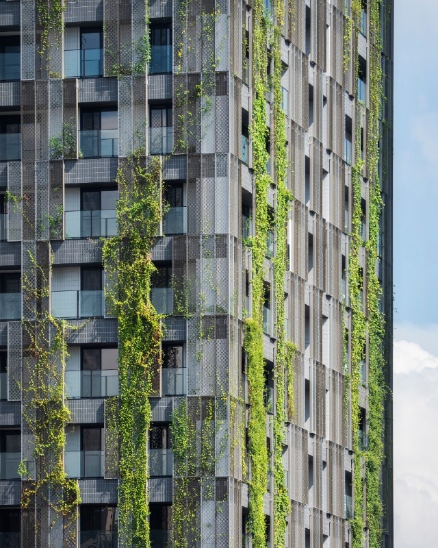 Studio WOHA brings nature placing trees on Tower A balconies, extended with this purpose, and placing a green screen on the facade of Tower B, made of a grid where plants can grow. Every five floors the building offers skygardens. Sky Green has been designed considering the subtropical climate of the region, earthquakes and typhoons.