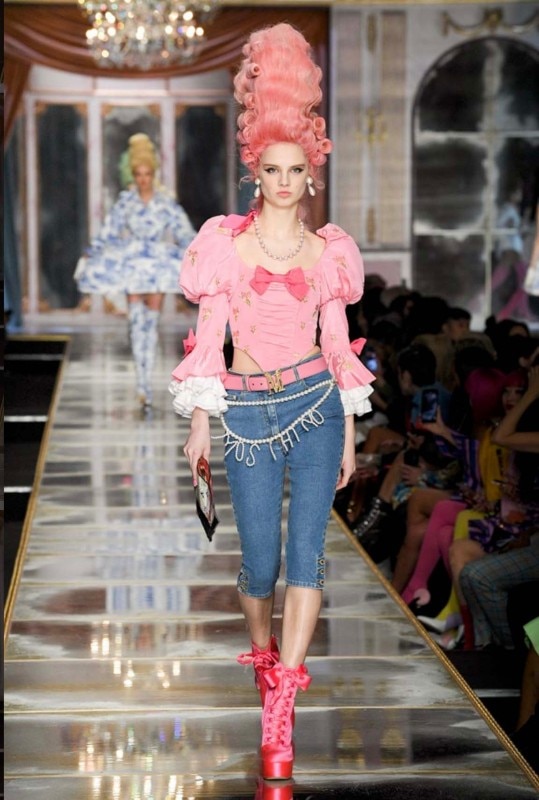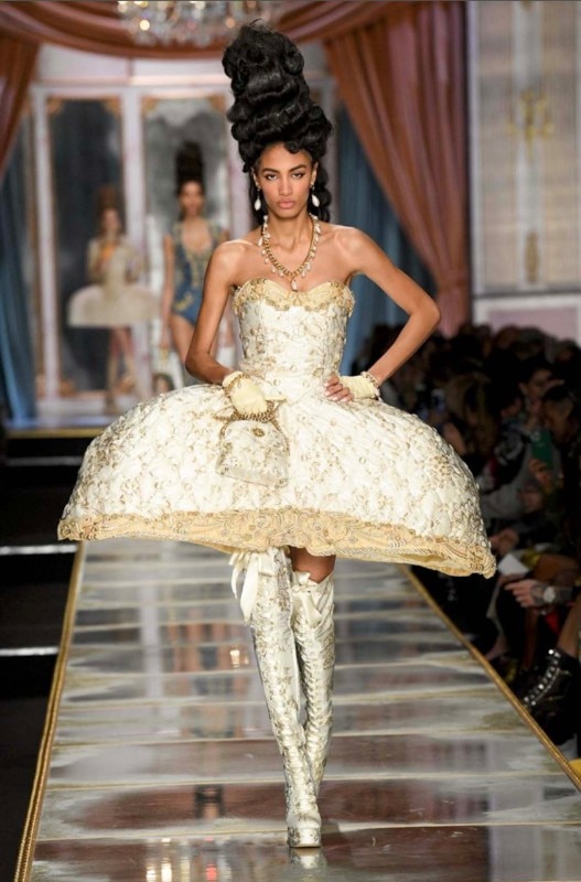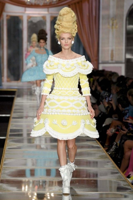 The party's at the palace! Moschino's flair proposes a loose reinterpretation of the eighteenth-century rooms, and immediately we find ourselves in Versailles. On the other hand, the creative director Jeremy Scott, as well as the residence wanted by the Sun King, represents the personification of magnificence and extravagance. The character of reference is Marie Antoinette, not so much the historical character as the one we know through the direction of Sofia Coppola: whimsical, eccentric and singular. The models are dressed up "to great effect"; between cheeky and impertinent smiles, the keywords are Dare and Wear.