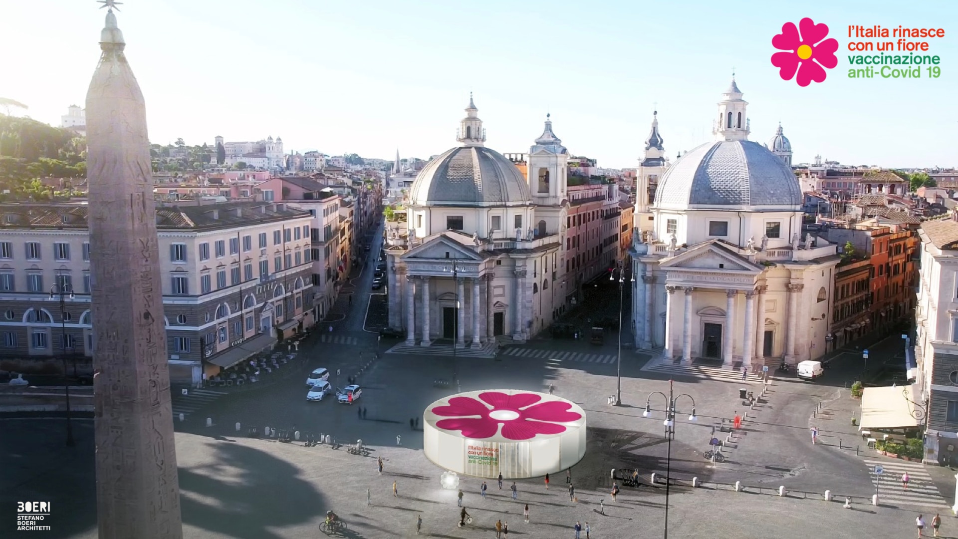 The architectural firm has signed the coordinated image for the Italian campaign on anti-Covid19 vaccines. From the logo to the temporary pavilions, many fuchsia primroses printed on canvas will fill Italian squares.