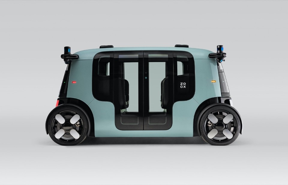 Zoox, the self-driving startup Amazon acquired back in June, has unveiled its first autonomous vehicle. It’s not a car, nor a van, but rather a quirky looking robotaxi that resembles a little a minibus with a symmetrical design. According to the company’s own definition the vehicle is a driverless carriage: it sports an electrical motor at each end and can drive in both directions, with a maximum speed of 75 km/h and a range of up to 16hrs before recharging, thanks to a double battery placed under each seat. Zoox’s robotaxi will sit four and initially will be employed to launch a fully autonomous ride hailing service in cities like San Francisco and Las Vegas.