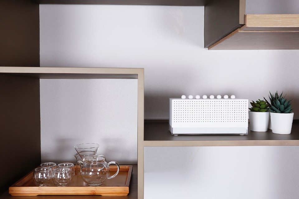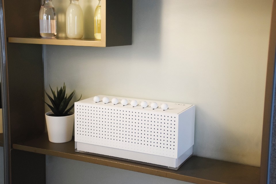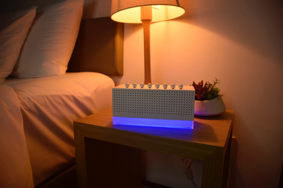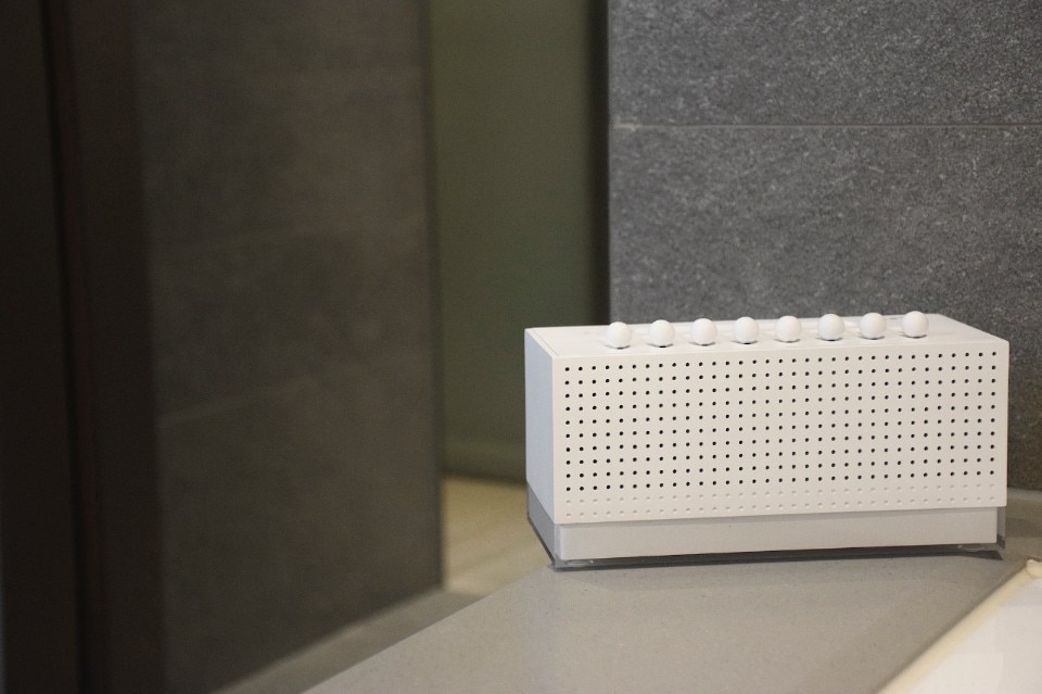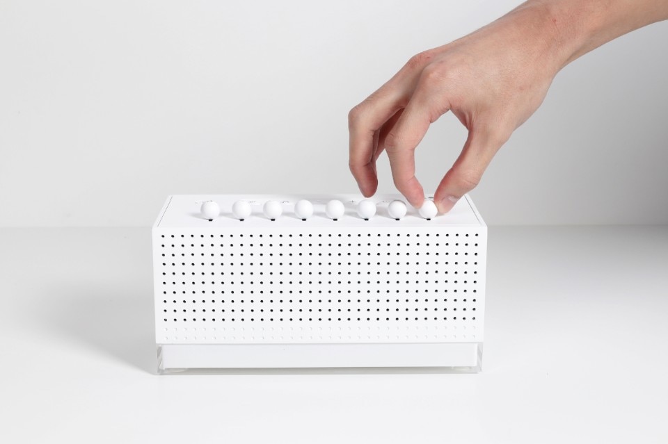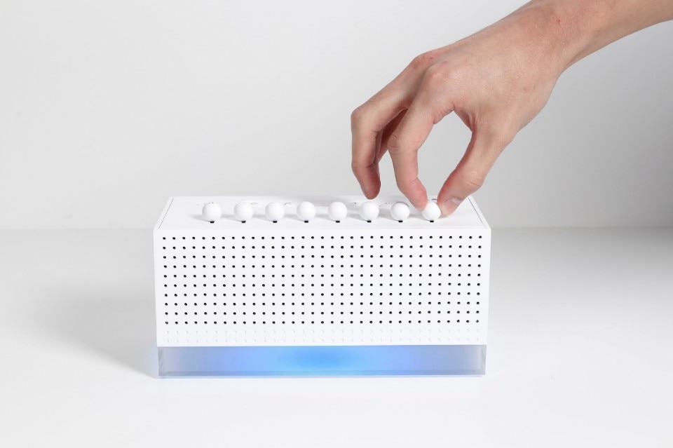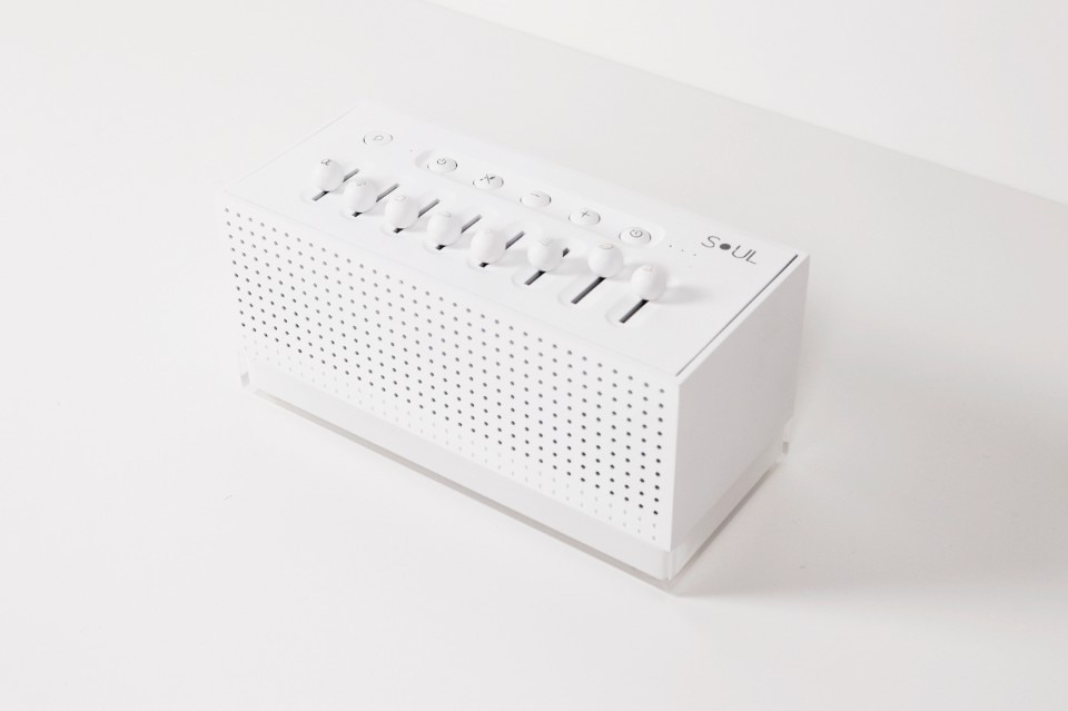 Measuring 20.5 x 12 x 9 cm, with a white acrylic and ABS shell, the top of the device features a mixer made up of 8 sliders, each of which can be used to adjust the intensity of a different natural sound and create hundreds of different combinations: from the rain to the chirping of birds, a crackling fire or a flowing river.