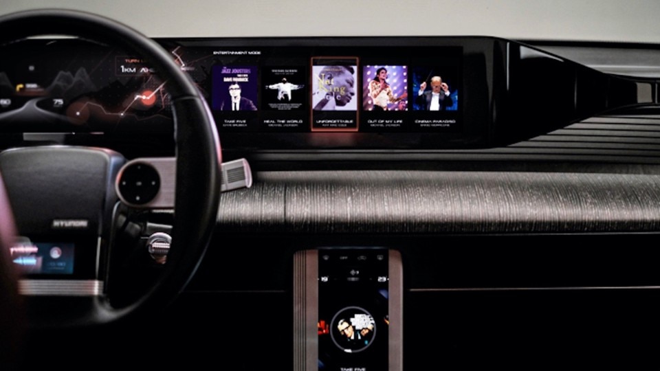 A large horizontal display extends over the dashboard inside the car, while a smaller vertical screen gives access to the old analog controls. The bronze ambient lighting is also a new touch that was missing from the original Grandeur. Hyundai says it’s inspired by vintage audio equipment.